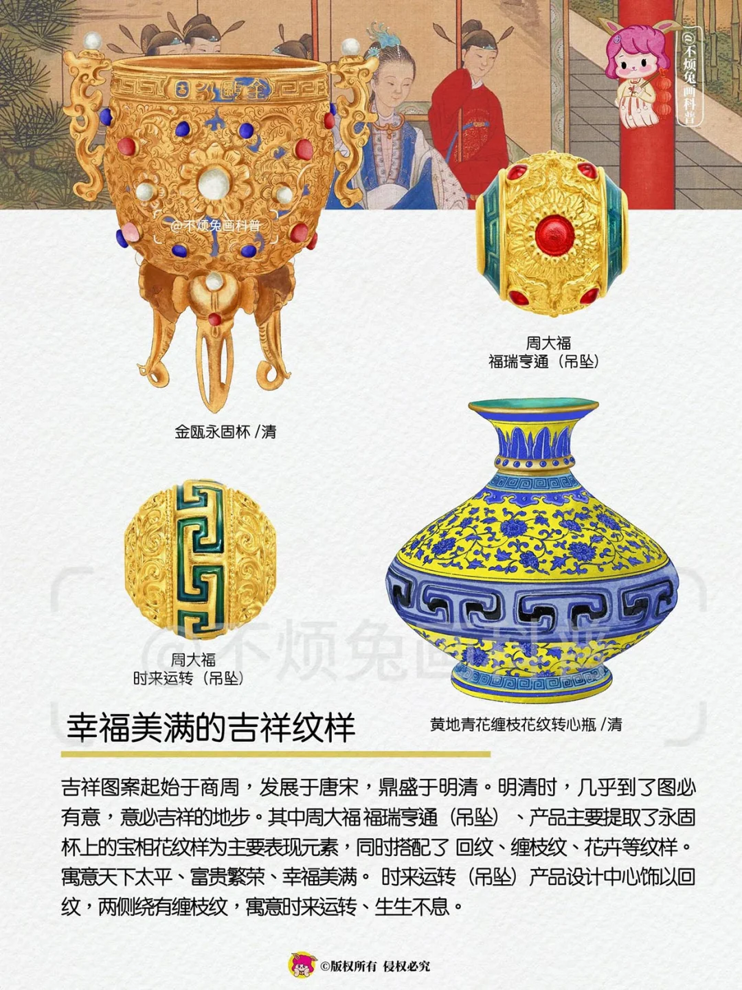 吉祥图案起始于商周,发展于唐宋,鼎盛于明清。其中周大福 福瑞亨通(吊坠)提取了永固杯上的宝相花纹样为主要表现元素,同时搭配了 回纹、缠枝纹、花卉等。寓意天下太平、富贵繁荣、幸福美满。 时来运转(吊坠)产品设计中心饰以回纹,两侧绕有缠枝纹,寓意时来运转、生生不息。