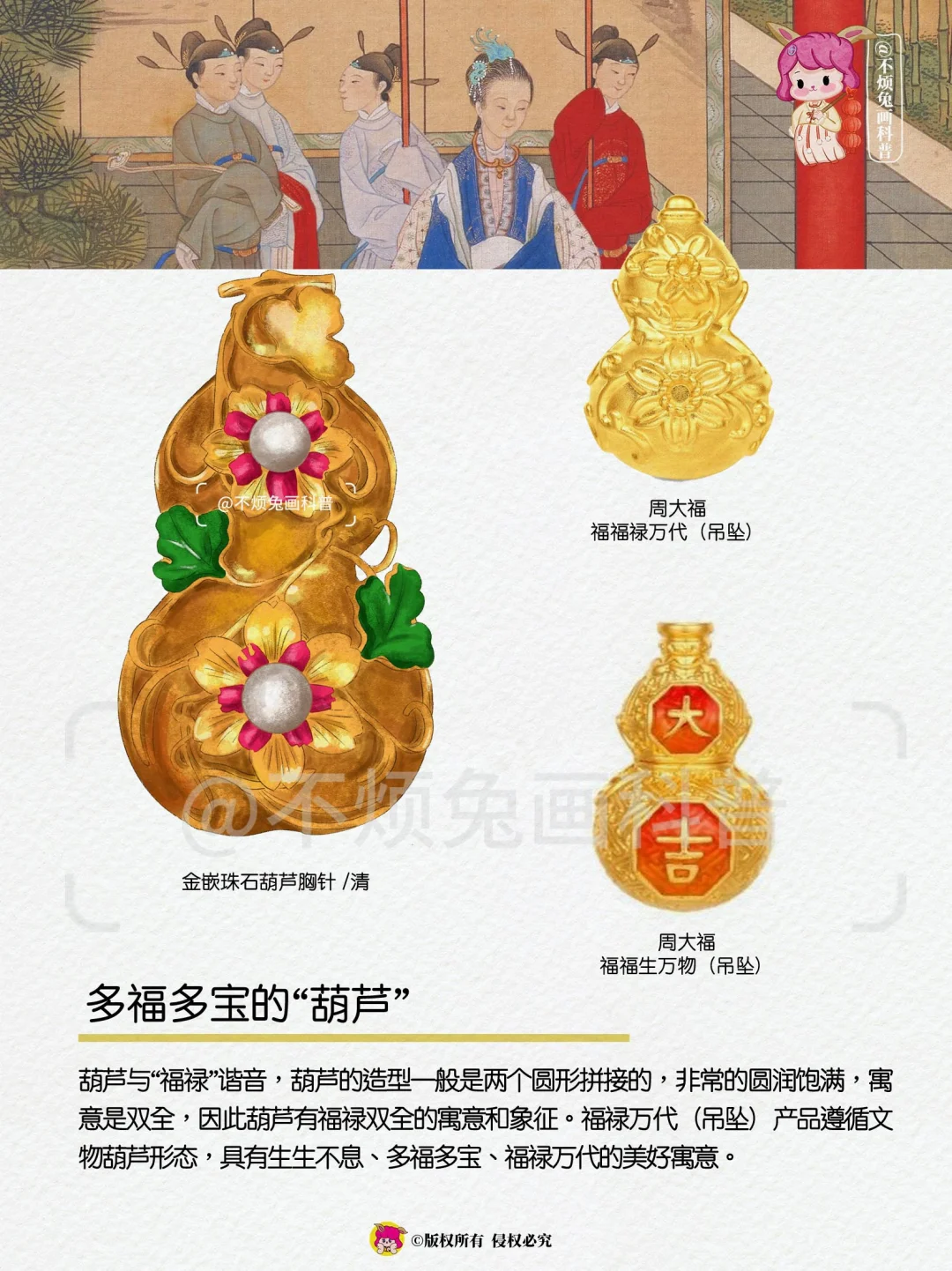 🔸现在越来越多年轻人痴迷玄学,觉得很神秘,很新奇、很有趣。殊不知现在流行的玄学,都是老祖宗们玩剩下的。在故宫博物院的馆藏中,从花、鱼到葫芦如意,从狮、象到麒麟青龙,每一样式都饱含吉祥和美之意,周大福和故宫博物馆合作的系列,将这些文物之美精细镌刻于珠宝,更是将美好祝福时刻收藏,见证人生美满幸福。 让穿越百年的吉祥祝福守护在侧,亦是美好常伴于心。