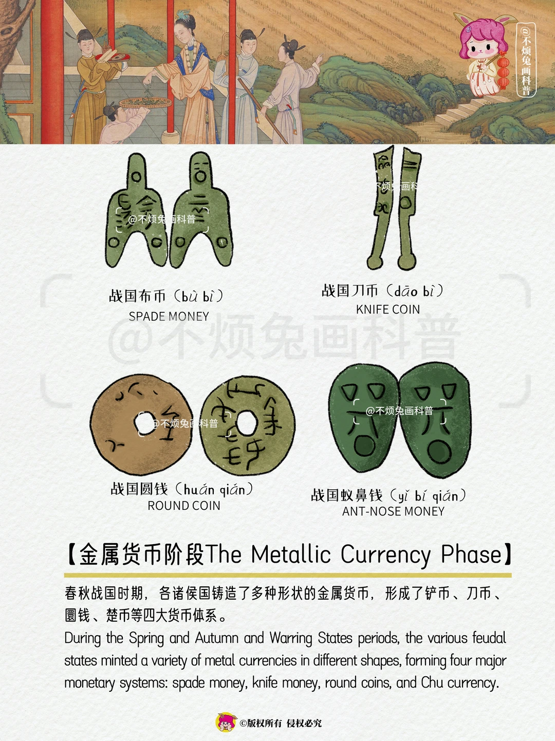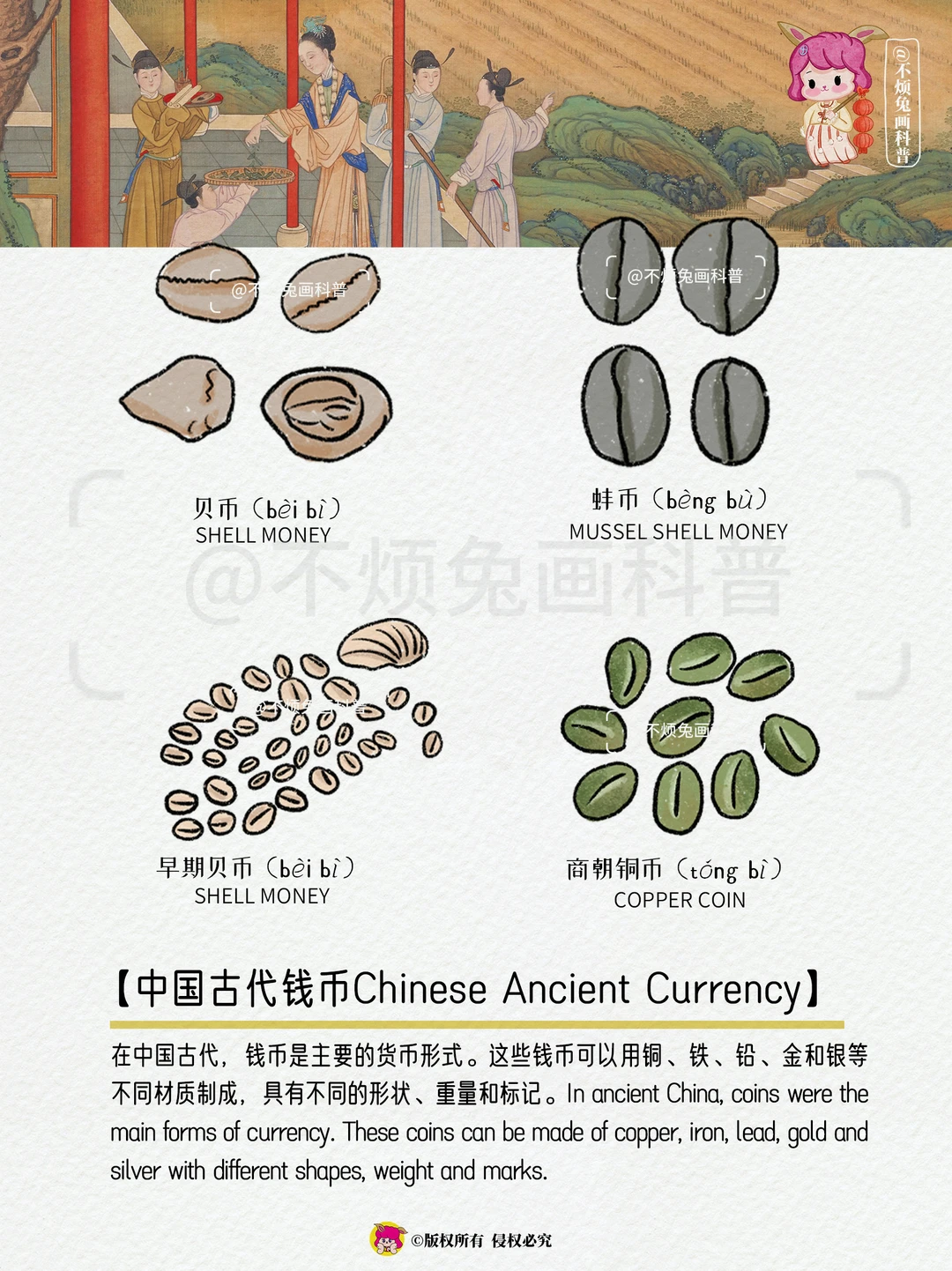 🔴在中国古代,钱币是主要的货币形式。这些钱币可以用铜、铁、铅、金和银等不同材质制成,具有不同的形状、重量和标记。In ancient China, coins were the main forms of currency. These coins can be made of copper, iron, lead, gold and silver with different shapes, weight and marks.
