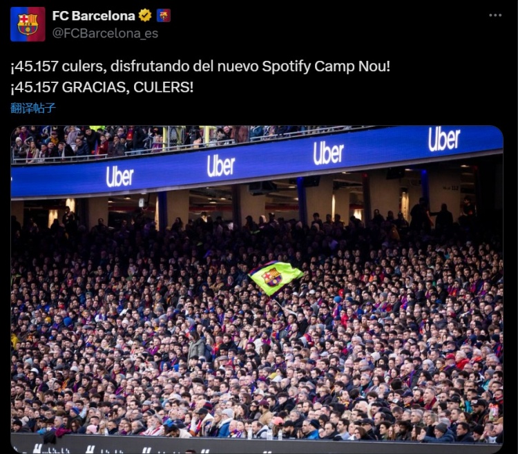 直播吧11月23日讯巴萨官方发布数据,重返诺坎普的首战共有45157名观众现场观赛。