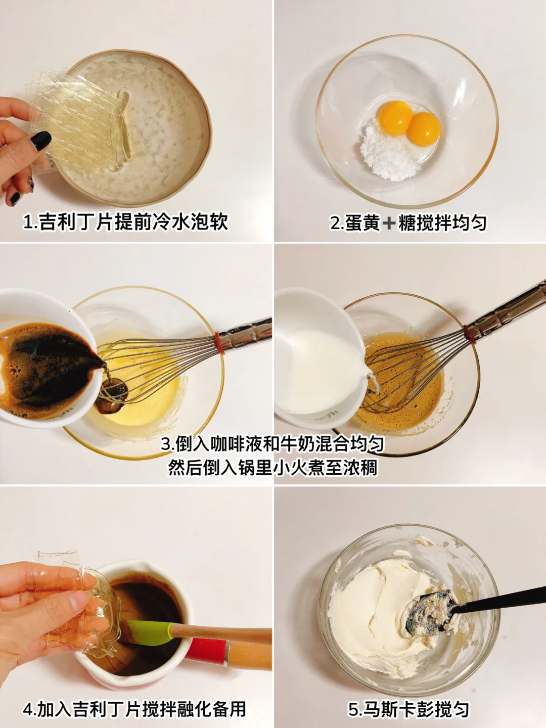 蛋黄2个|糖35g|咖啡液50g(8g咖啡粉+42g水)|牛奶30g|吉利丁片2.5g|马斯卡彭250g|淡奶油150g|手指饼干适量