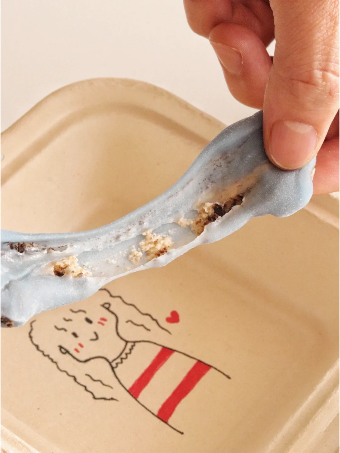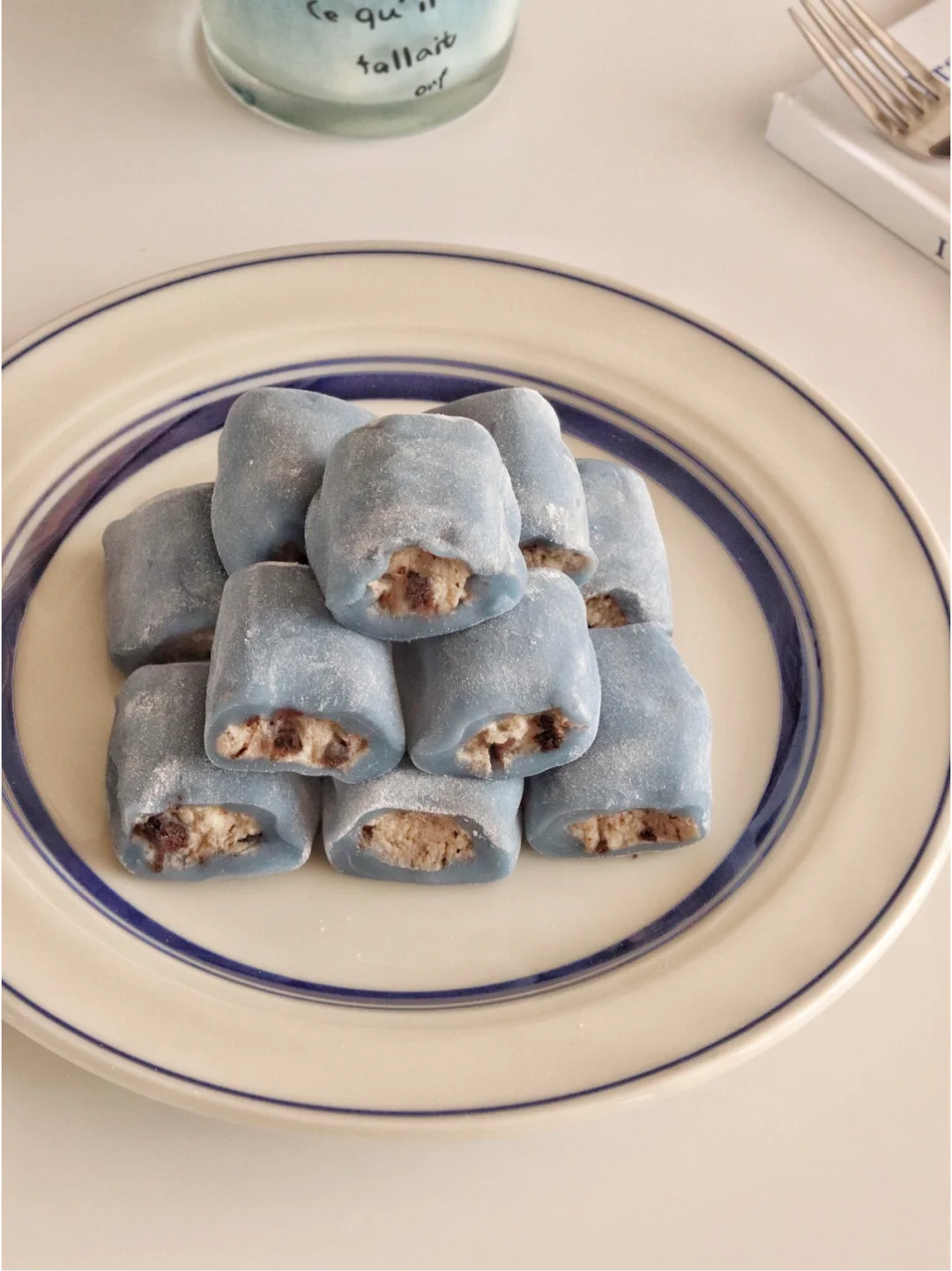 4️⃣奥利奥压碎,加入奶油奶酪🧀和海盐拌匀整成长条,包入糯米皮里,然后切成小块即可✅