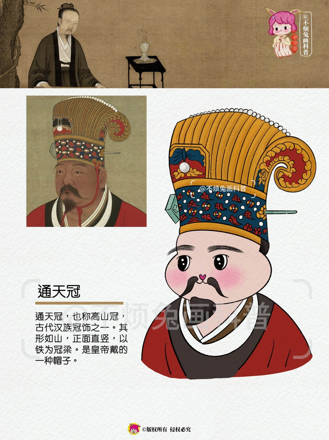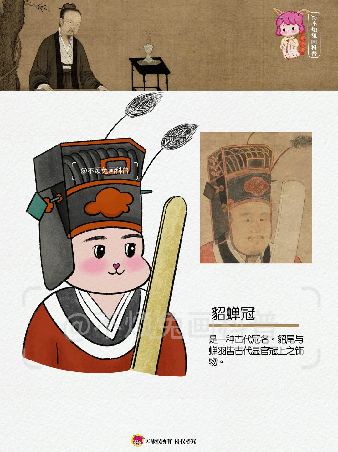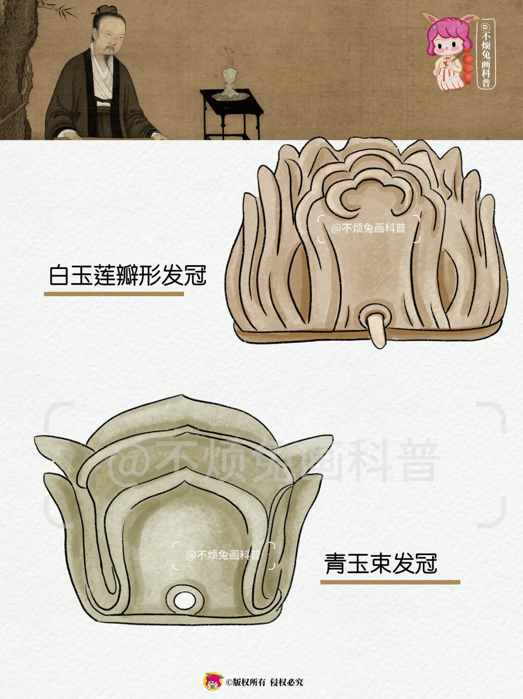【宋代男子冠饰】 在古代,冠的样式繁多,用途各异,其发展历经数代的传承演变,在出土文物中常有体现。根据相关出土文物证明,商代,男子已经戴用“冠服”了。但其样式与今天的帽子迥异,古代的“冠”重在象征礼仪,体现的是礼法,头上的“冠”通常只需覆盖一部分头顶,实用功能退居礼法之后。那么宋代男子常见都戴什么“头冠”呢?我们一起来看看吧! - 【头冠种类】 1️⃣通天冠(皇帝佩戴) 2️⃣进贤冠(朝见皇帝) 3️⃣貂蝉冠(头冠装饰) 4️⃣玉发冠(贵族束发) -