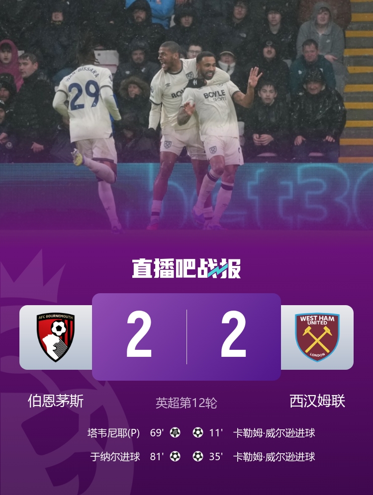 直播吧11月23日讯北京时间11月22日23时,英超第12轮,伯恩茅斯坐镇活力球场迎战西汉姆联。上半场,威尔逊连入两球上演梅开二度!半场战罢,伯恩茅斯暂2-0西汉姆联;下半场,基尔曼手球送点,塔维尼耶点射破门,于纳尔替补破门扳平比分,阿雷奥拉屡献神扑!全场比赛结束,伯恩茅斯2-2西汉姆联!