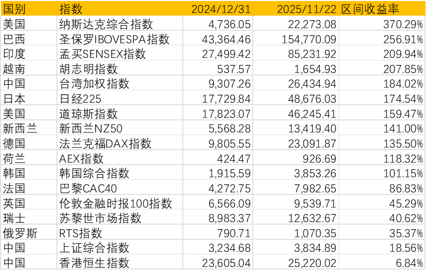 发在视频号的那张图是来自《我独自升级》这样一个动漫作品,经常被用来做各种梗图,尤其适合涉及到排名的场景,其中的排名标记用的是自2014年底以来的收益率,美国纳斯达克指数、巴西圣保罗指数、印度孟买指数是位居前三的,加上越南的胡志明指数,四个指数收益率都超过了200%;中国三个市场指数中,台湾加权指数排名靠前,达到了184%的收益,而上证指数和恒生指数则表现比较差,10年多的时间分别录得18.56%、6.84%的收益率。