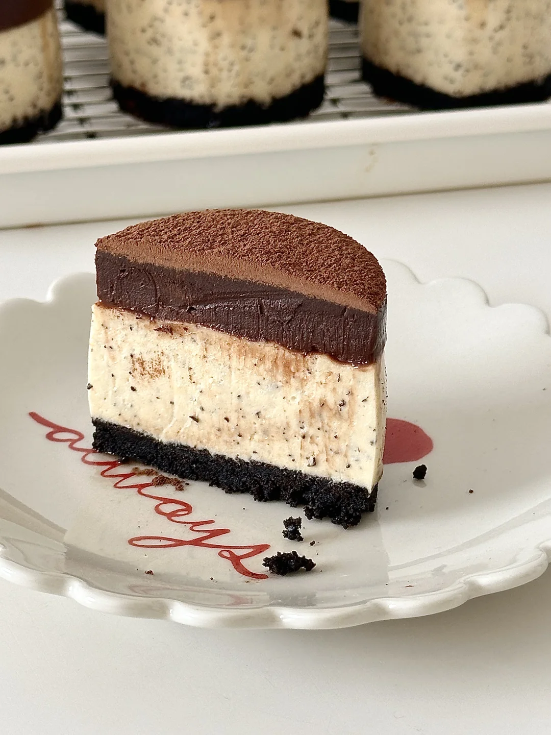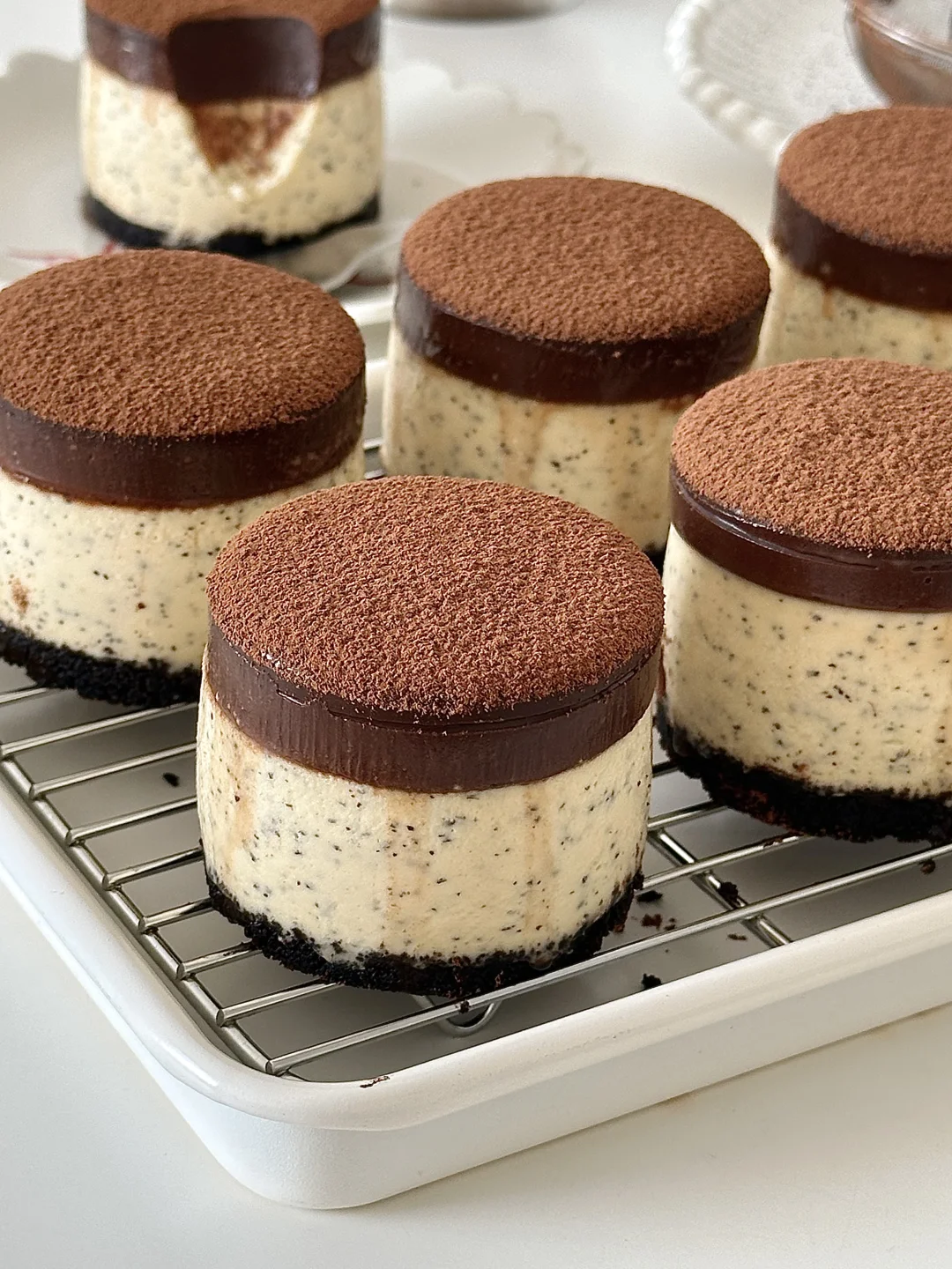 5. 生巧食材混合隔热水搅拌融化,倒在慕斯上面,冰箱冷藏4小时,脱模后筛上可可粉🆗