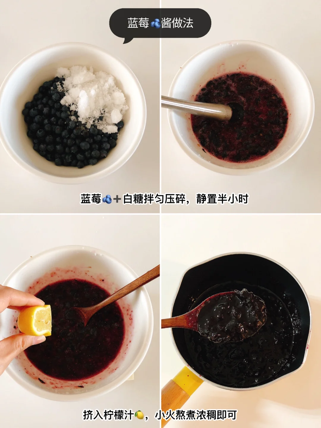 - 蓝莓加糖拌匀压碎,静置半小时,挤入柠檬汁,小火熬煮浓稠即可