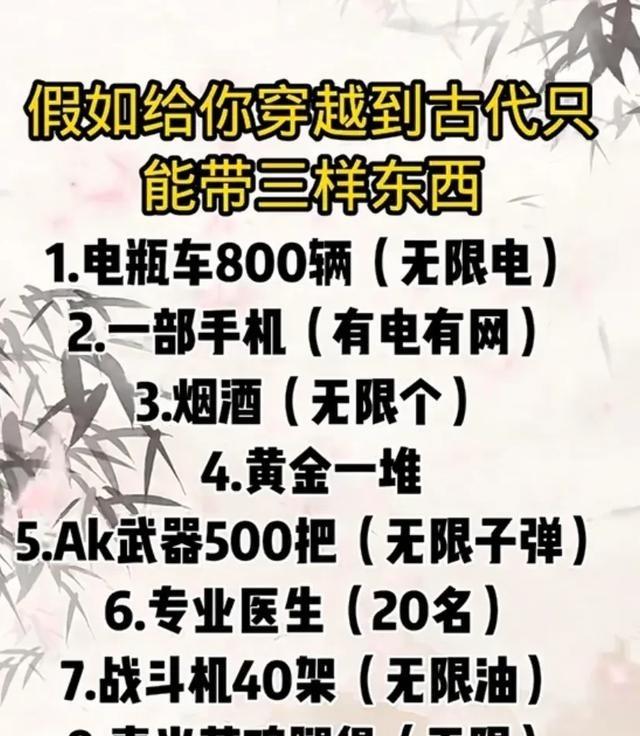 假如让你穿越到古代只能带三样东西带什么1.电瓶车800辆(无限电) 2.一部手机