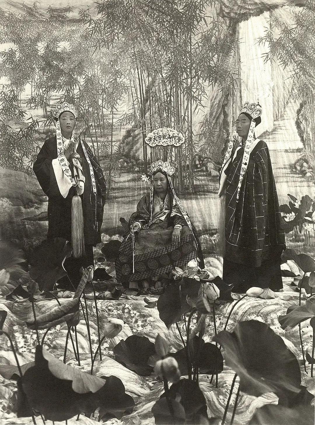 1903年,慈禧太后在颐和园留影,左侧站立者是太监崔玉贵,右侧站立者是太监李莲英。这是慈禧晚年拍摄的“cosplay”,她自比“救苦救难的观音菩萨”,身边的太监则扮作“护法”。