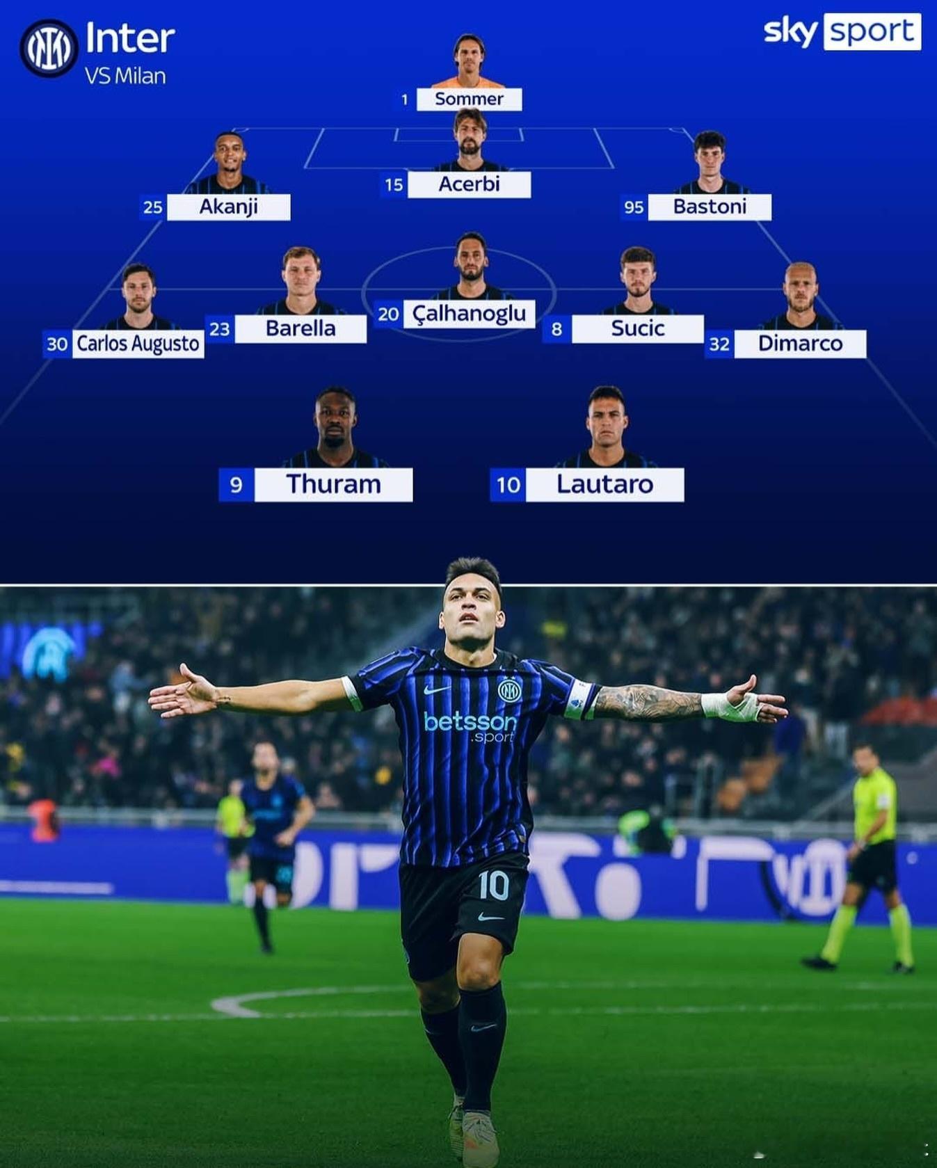 天空体育预测国际米兰德比首发,阿切尔比和苏西奇首发。💙🖤