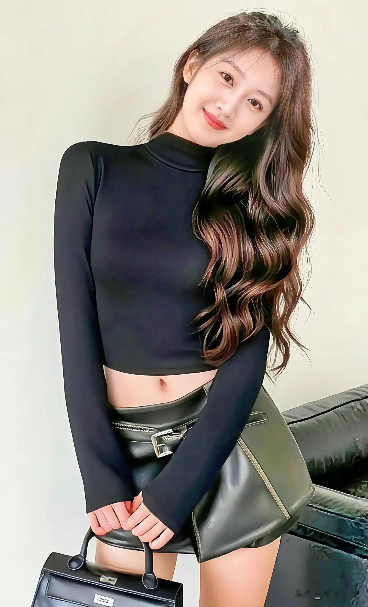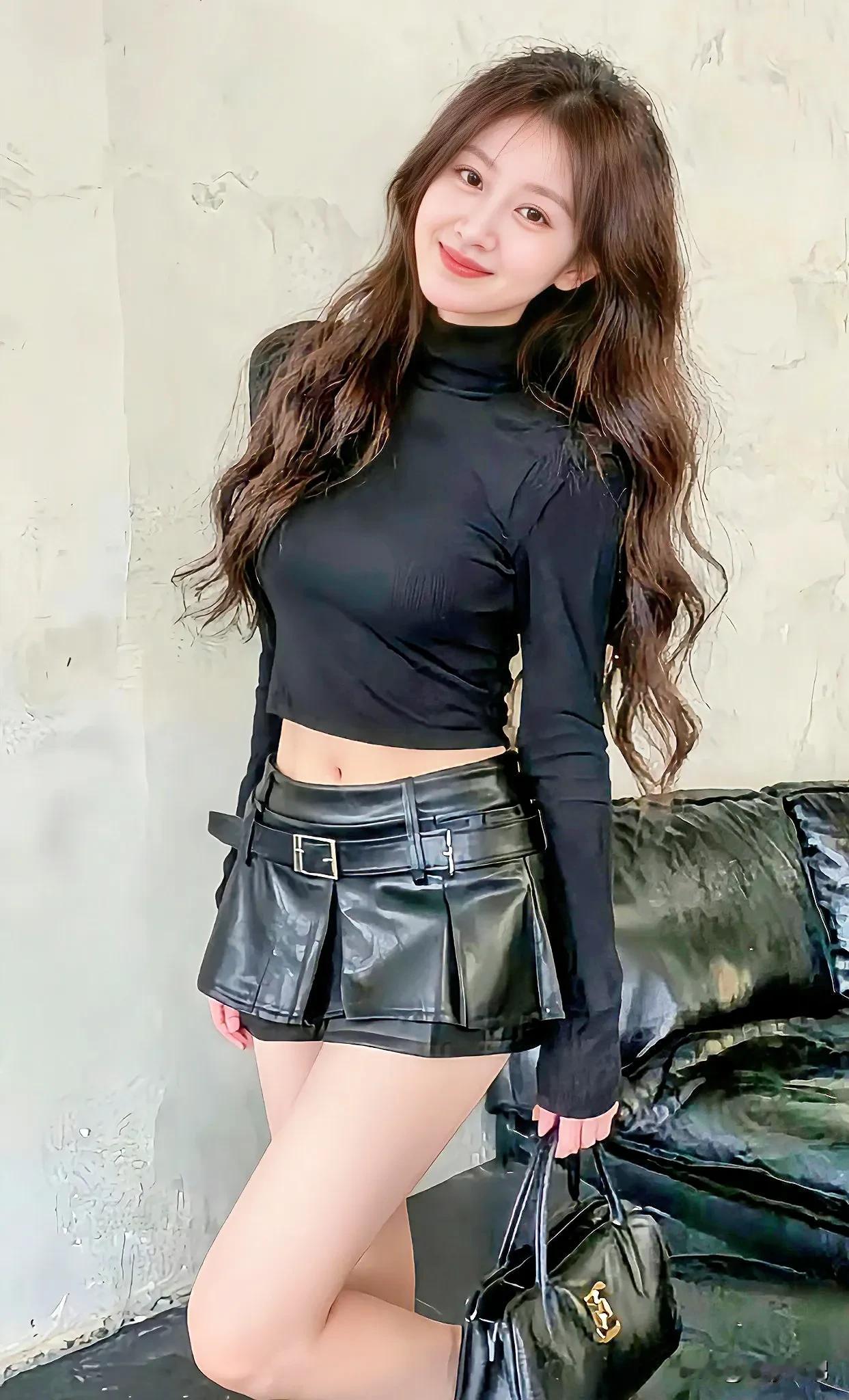 这个小姐姐穿着酷酷的黑色皮裙,搭配高领长袖上衣,显得时尚又有个性。