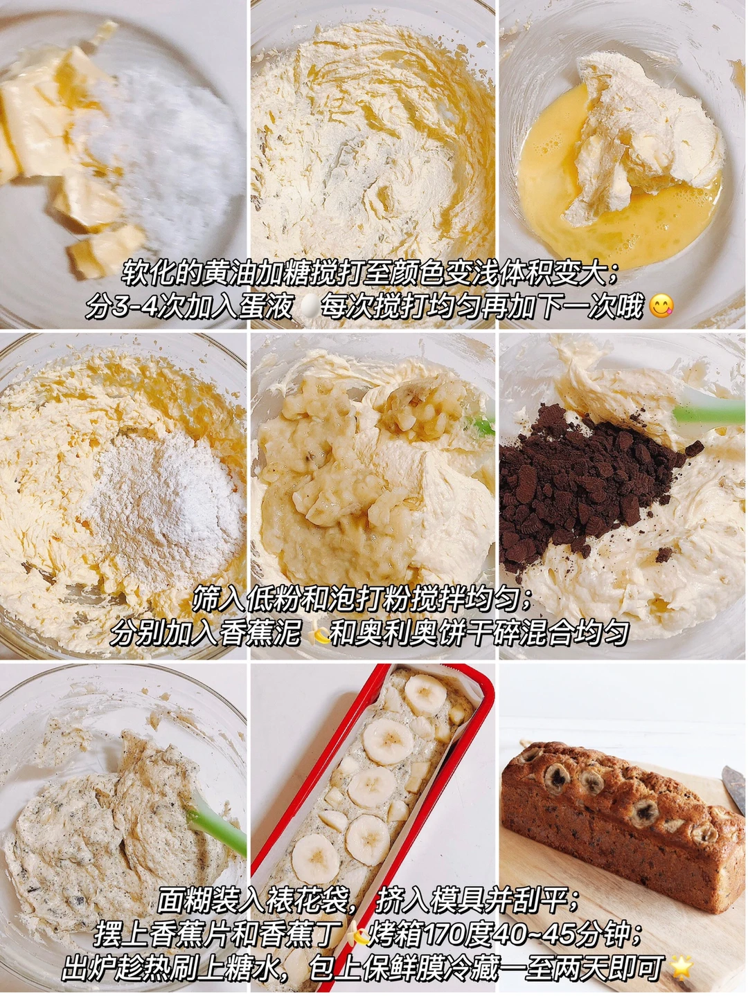 4️⃣其中一根香蕉🍌压成泥和奥利奥碎一起倒入步骤3️⃣混合均匀,装入裱花袋挤入模具,另外一根香蕉切片和小块摆在蛋糕糊上面