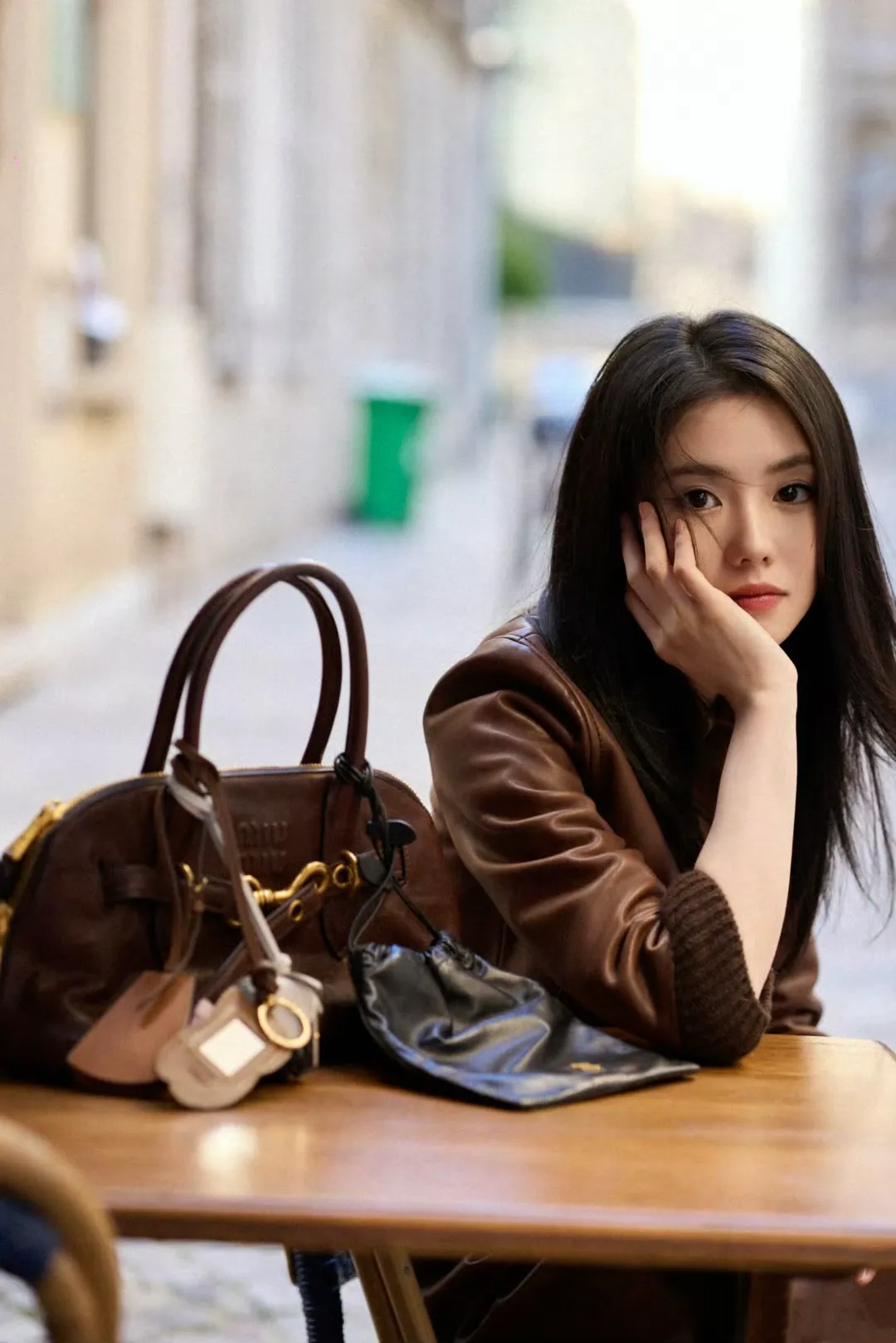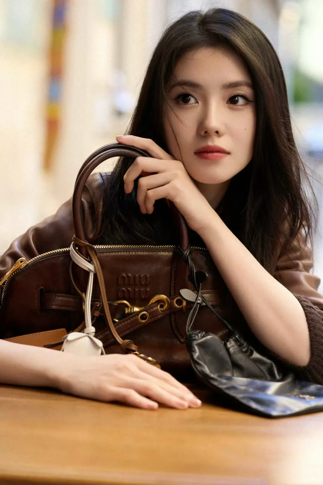 刘浩存小皮裙造型写真 刘浩存身穿棕色小皮裙套装搭配高筒皮靴,手拿小香包...