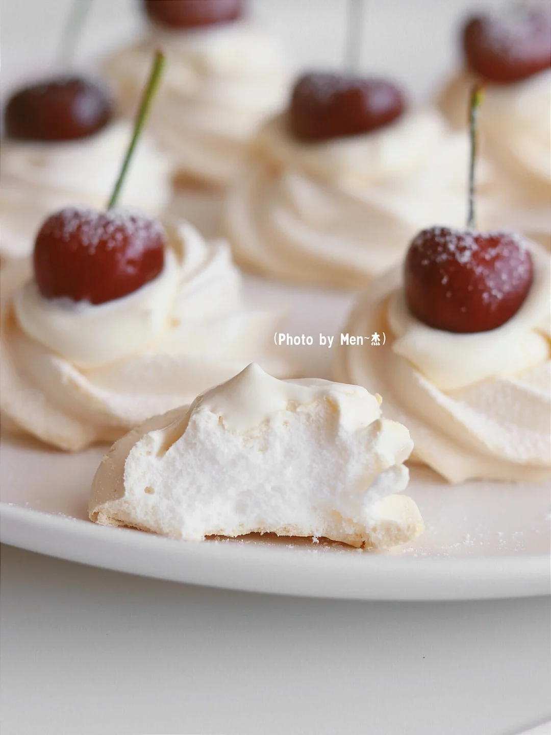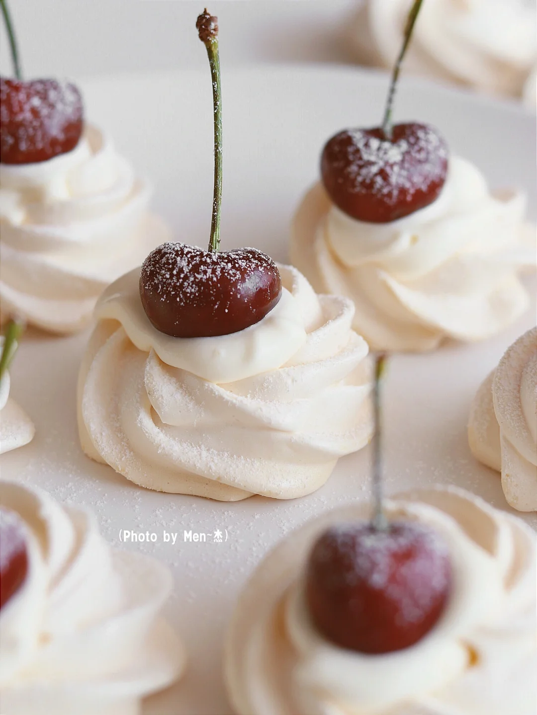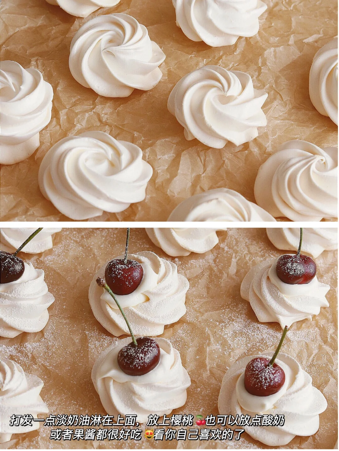 4️⃣打发一点奶油淋在帕夫洛娃上,再放上樱桃或是你喜欢的其它水果都🆗