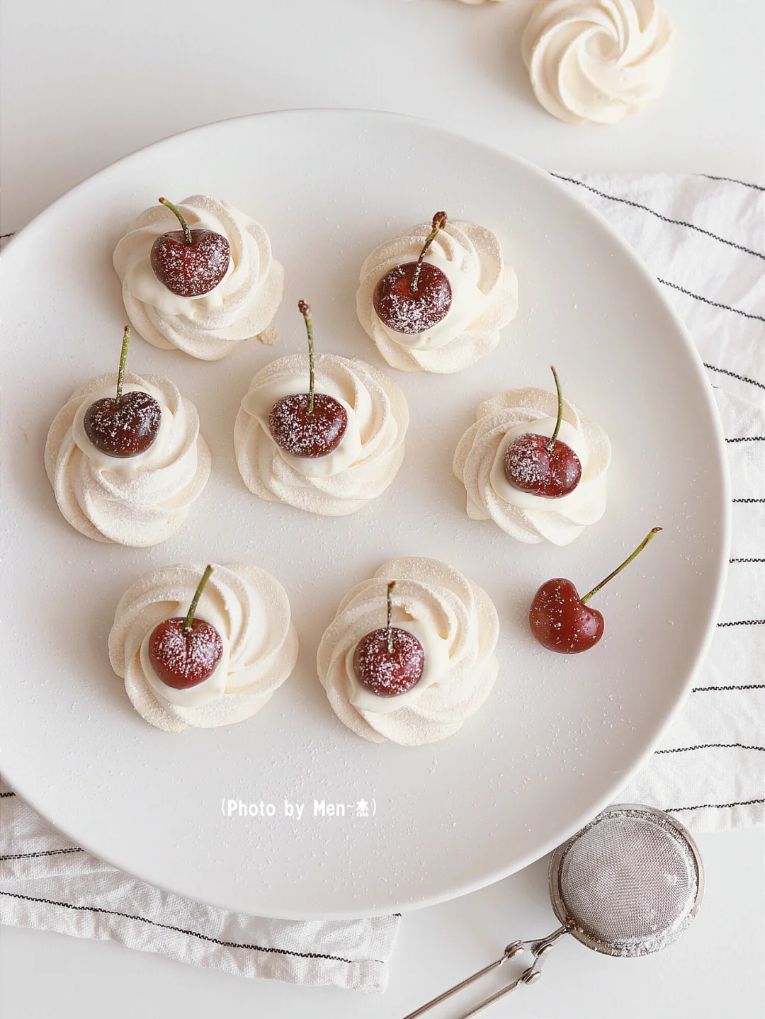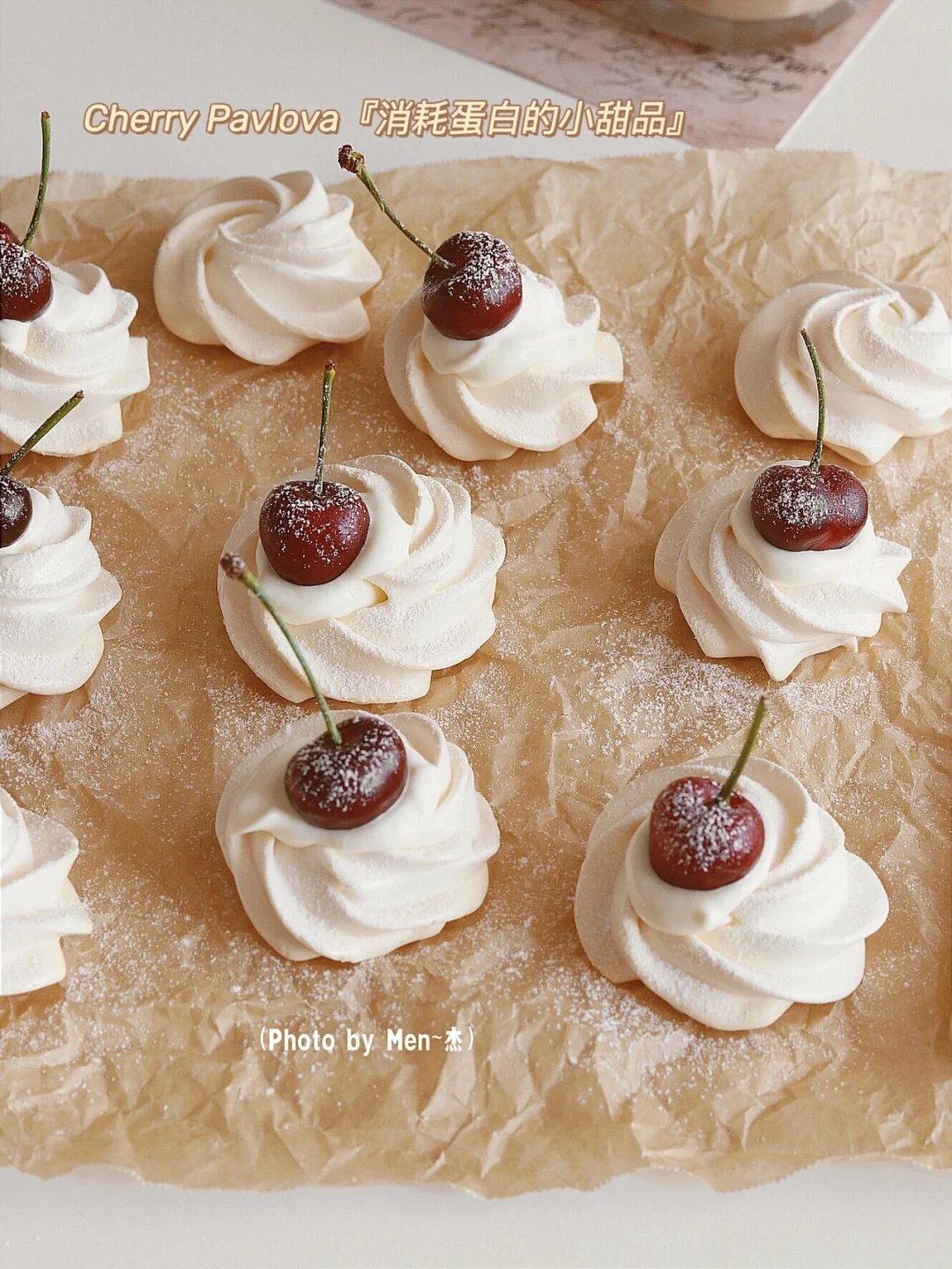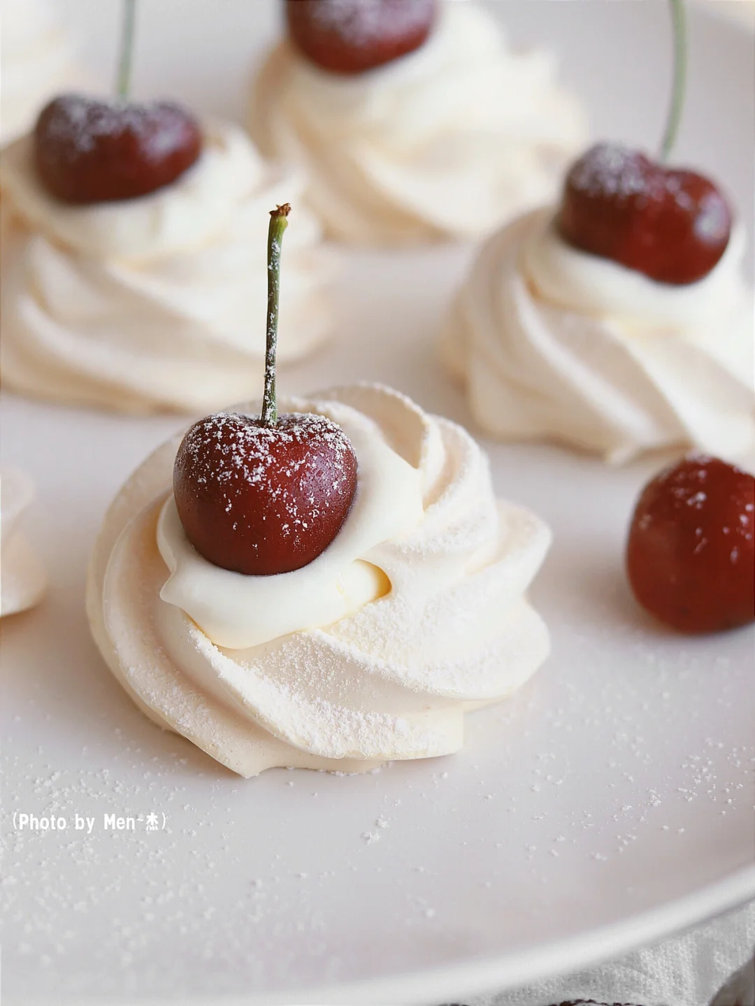 4️⃣打发一点奶油淋在帕夫洛娃上,再放上樱桃或是你喜欢的其它水果都🆗