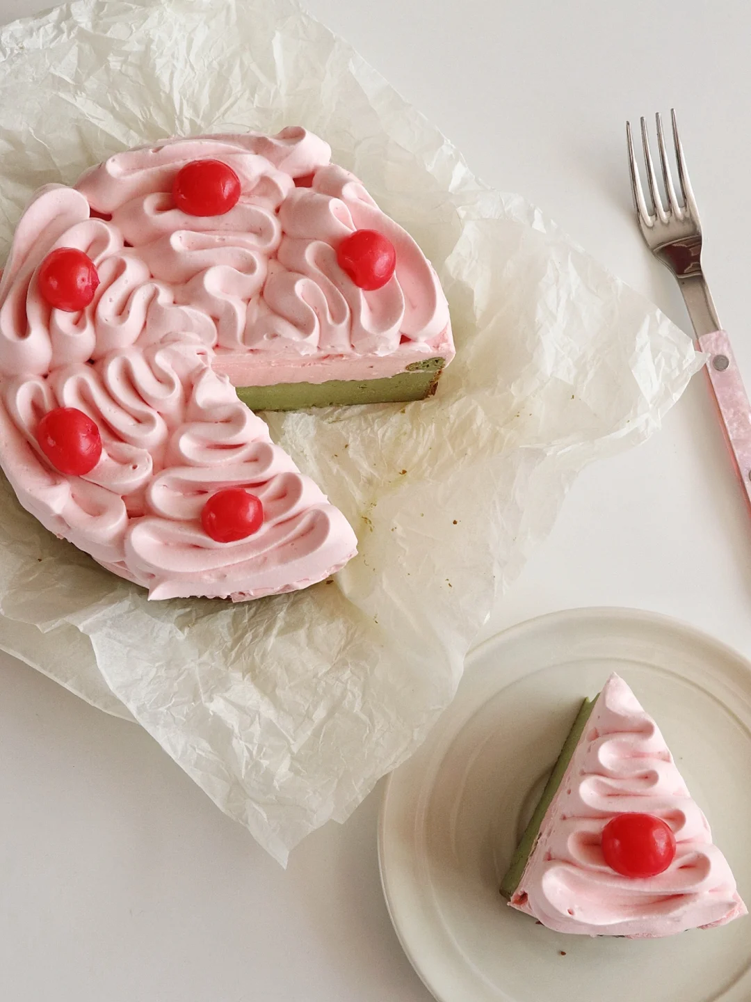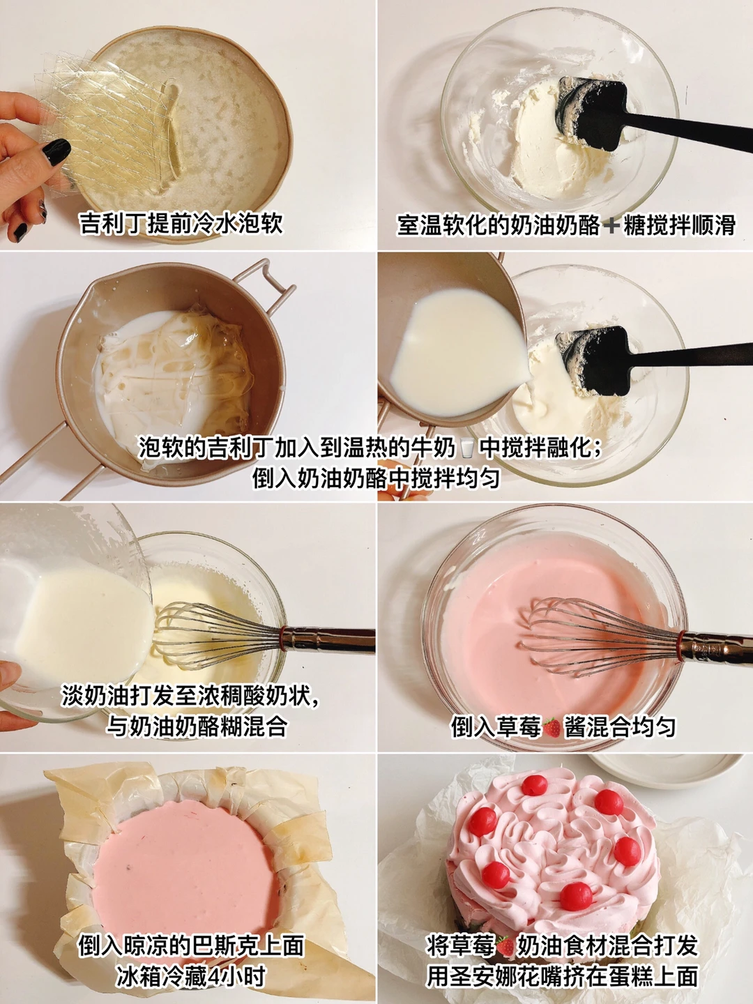 ‼️草莓慕斯和草莓奶油部分我都加了一丢丢粉色素,不加也可以哈,颜色没有这么粉嫩😎