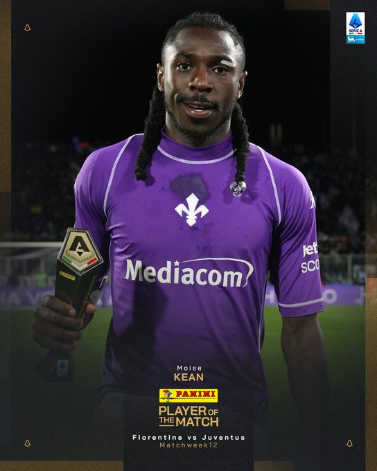 意甲官方:小基恩当选佛罗伦萨1-1尤文全场最佳球员
