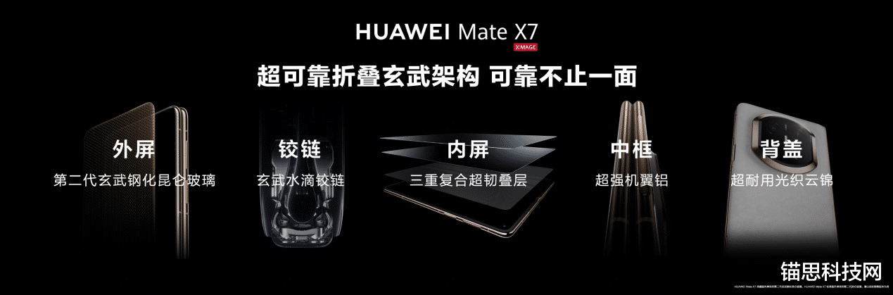 HUAWEI Mate X7机身架构实现革命性突破,搭载超可靠折叠玄武架构,可靠不止一面。第二代玄武钢化昆仑玻璃外屏、玄武水滴铰链、三重复合超韧叠层内屏、超强机翼铝中框、超耐用光织云锦背盖,五大升级协同,构筑超强防护,为用户提供可靠安心体验。折叠屏手机轻薄与可靠实现二者兼得。
