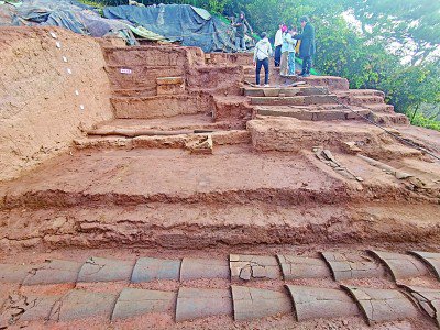 琅琊台遗址发掘现场。近景是由陶管套接而成的地下管道,远处的台阶由雕有龙纹的空心砖铺成。本报记者李韵摄/光明图片