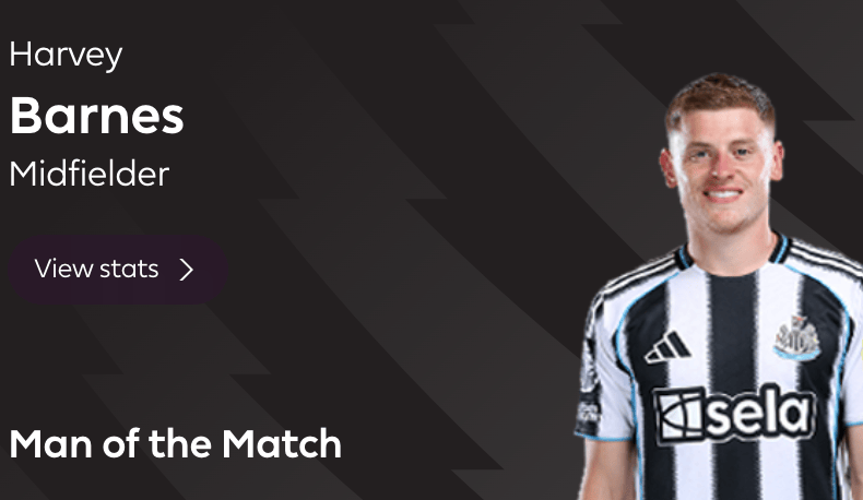 梅开二度!官方:巴恩斯当选纽卡2-1曼城一役全场最佳球员