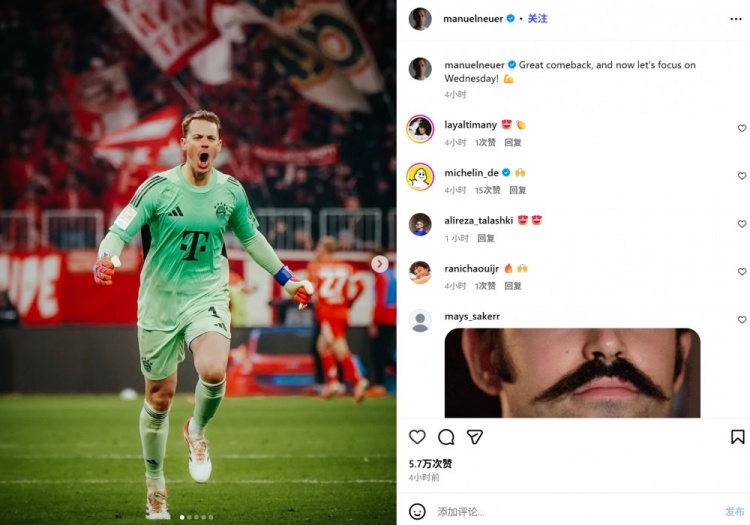 诺伊尔晒出自己的庆祝照,并配文:“伟大的逆转!现在让我们专注于周三的比赛!”
