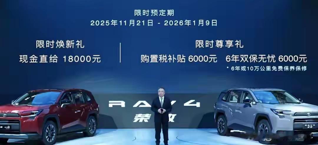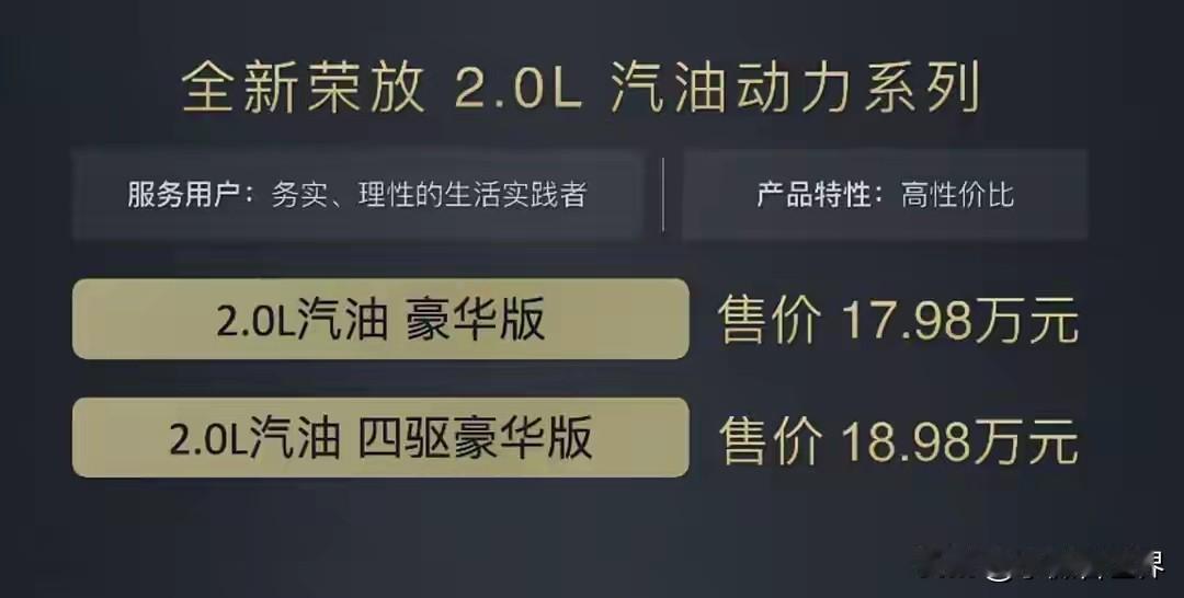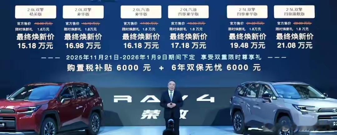 不管你信不信,现在的人买车都很现实: 1、50%选混动 2、30%选纯油 3、20%选纯电 11月19日,一汽丰田全新RAV4荣放首发亮相,小号普拉多,配置丰富,三种动力,会火吗? 自1994年诞生以来,RAV4一直是丰田全球市场的战略车型之一。用户遍布180多个国家和地区,全球年销量超过100万辆,累计销量超过1500万辆。 就说第六代RAV42.0L混动版吧, 2.0L四驱豪华版配备2.0L自然吸气发动机与四驱系统,拥有TSS 4.0智驾辅助系统和15.6英寸2.5K中控屏高通8155芯片等。 外观使用了全新的设计风格,前脸分体式进气格栅与“C”字造型前灯组的组合,使得整车辨识度大幅提升,整体造型更具力量感,更偏向越野风格。 车身结构经过重新设计,A/B柱采用1470兆帕超高强度钢。车身钢性提升97%,特殊位置加强保护,1470Mpa超高强度钢材,确保整车碰撞安全。 搭载的是TSS 4.0智驾辅助系统,配备24个高精度传感器,能在大雨、浓雾等极端天气下清晰感知环境,提前预判风险,从而实现了安全监测、情绪识别与数据隐私保护三重平衡。 全新荣放搭载的2.0L智能电混双擎,实测百公里油耗仅3.99L,每公里成本约0.27元。无需充电,没有续航焦虑,却享受纯电般的平顺静谧及经济性。 日常通勤不费油,周末越野不犯怵,全家长途不疲惫,第六代RAV4荣放把家用SUV的实用与灵活,戳中了普通人用车的核心需求。那么它会成为爆款么?且让我们拭目以待吧。