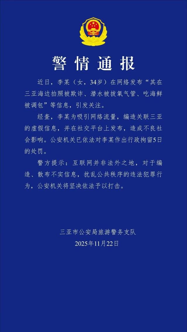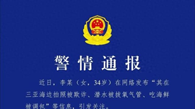 11月22日,三亚市公安局旅游警务支队发布警情通报:近日,李某(女,34岁)在网络发布“其在三亚海边拍照被欺诈、潜水被拔氧气管、吃海鲜被调包”等信息,引发关注。