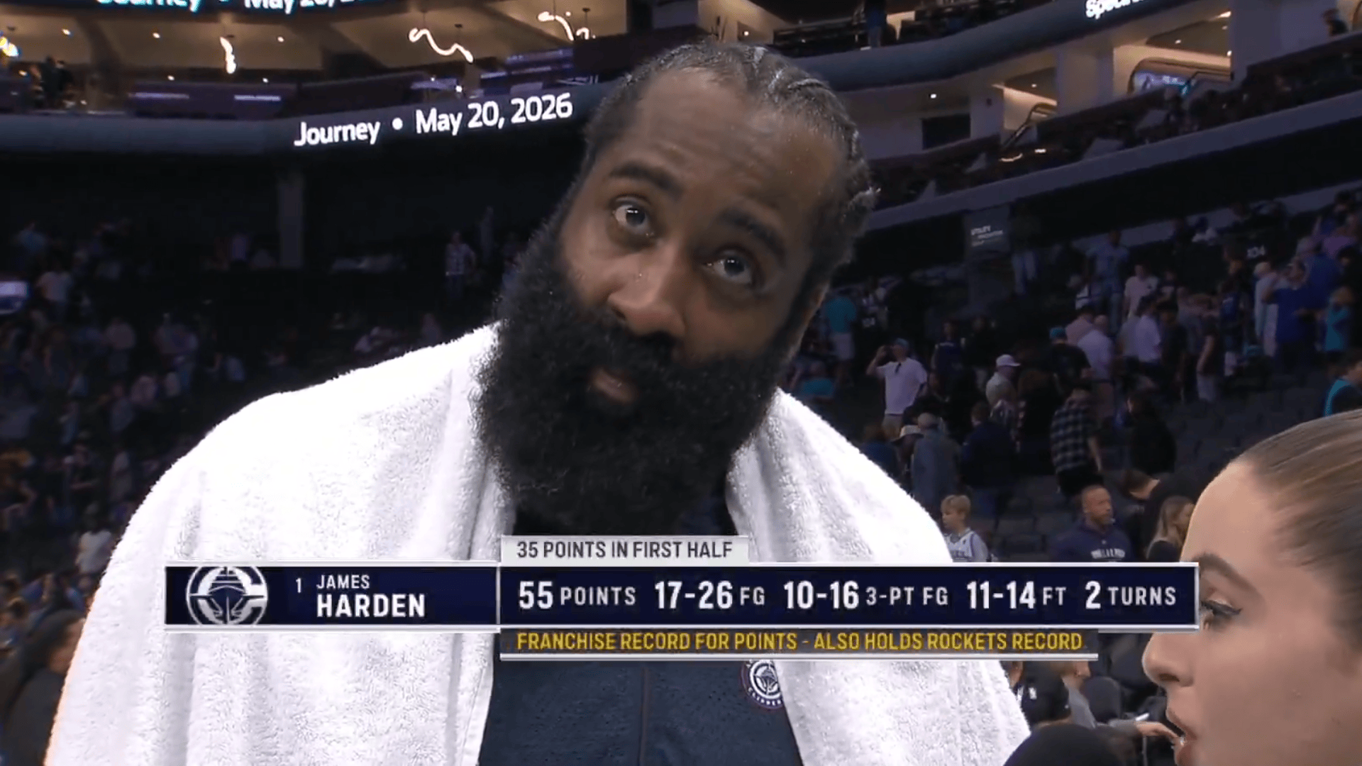 本场比赛,快船球员詹姆斯-哈登出战35分钟,26投17中,其中三分球16投10中,罚球14投11中,得到55分3篮板7助攻1抢断。