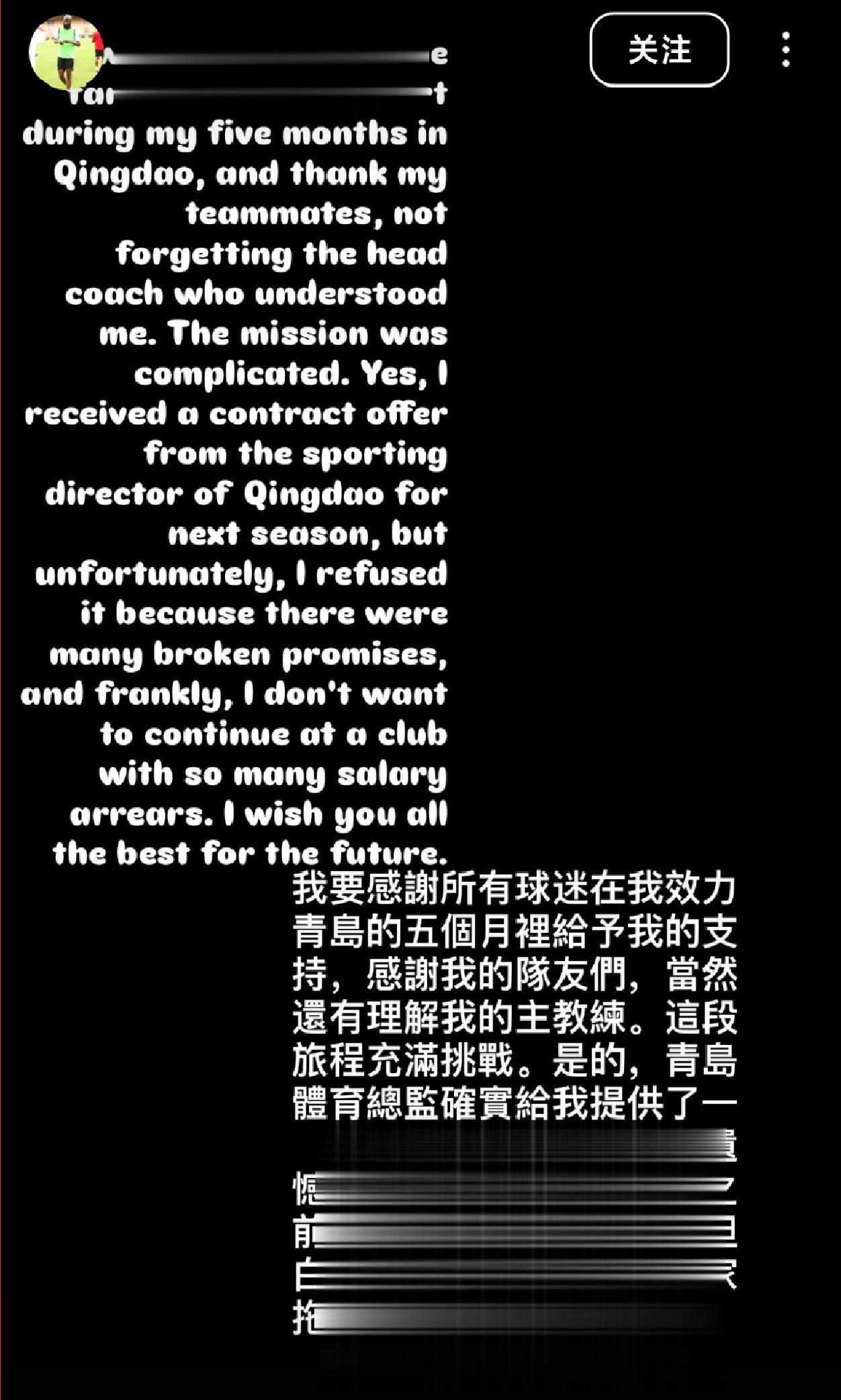 我要感谢所有球迷在我效力青岛的五个月里给予我的支持,感谢我的队友们,当然还有理解我的主教练。这段旅程充满挑战。是的,青岛体育总监确实给我提供了一份下赛季的合同,但很遗憾,我拒绝了,因为他们之前有很多承诺没有兑现,坦白说,我不想继续留在一家拖欠这么多工资的俱乐部。祝大家未来一切顺利。