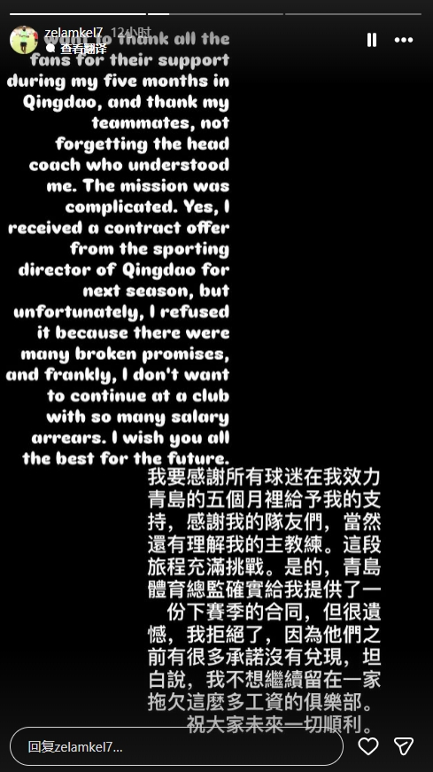他写道:“我要感谢青岛所有球迷在五个月给予我的支持,感谢我的队友们,当然还有理解我的主教练。这段旅程充满挑战。是的,青岛体育总监确实给我提供了一份下赛季的合同,但很遗憾,我拒绝了,因为他们之前有很多承诺没有兑现,坦白说,我不想继续留在一家拖欠这么多工资的俱乐部。祝大家未来一切顺利。”