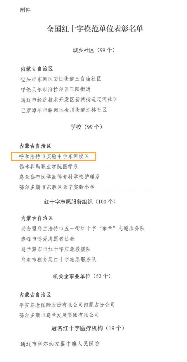 近日,中国红十字会总会印发了《关于表彰全国红十字模范单位的决定》,授予99个城乡社区、99个学校、100个红十字志愿服务组织、52个机关企事业单位和19个冠名红十字医疗机构“全国红十字模范单位”称号。其中,呼和浩特市实验中学东河校区等上榜。