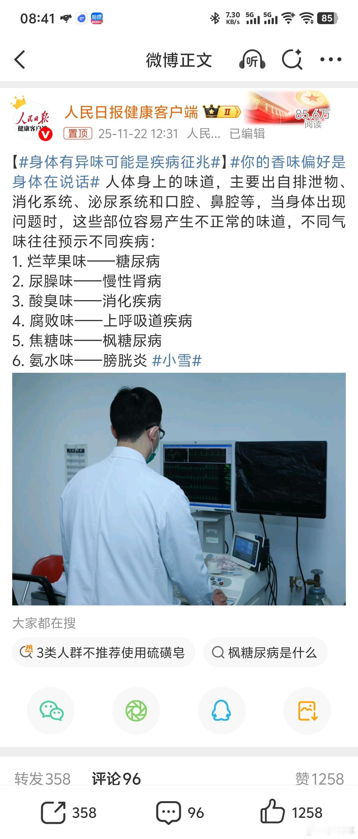 各位都要注意身体啊1. 烂苹果味——糖尿病2. 尿臊味——慢性肾病3. 酸臭味—