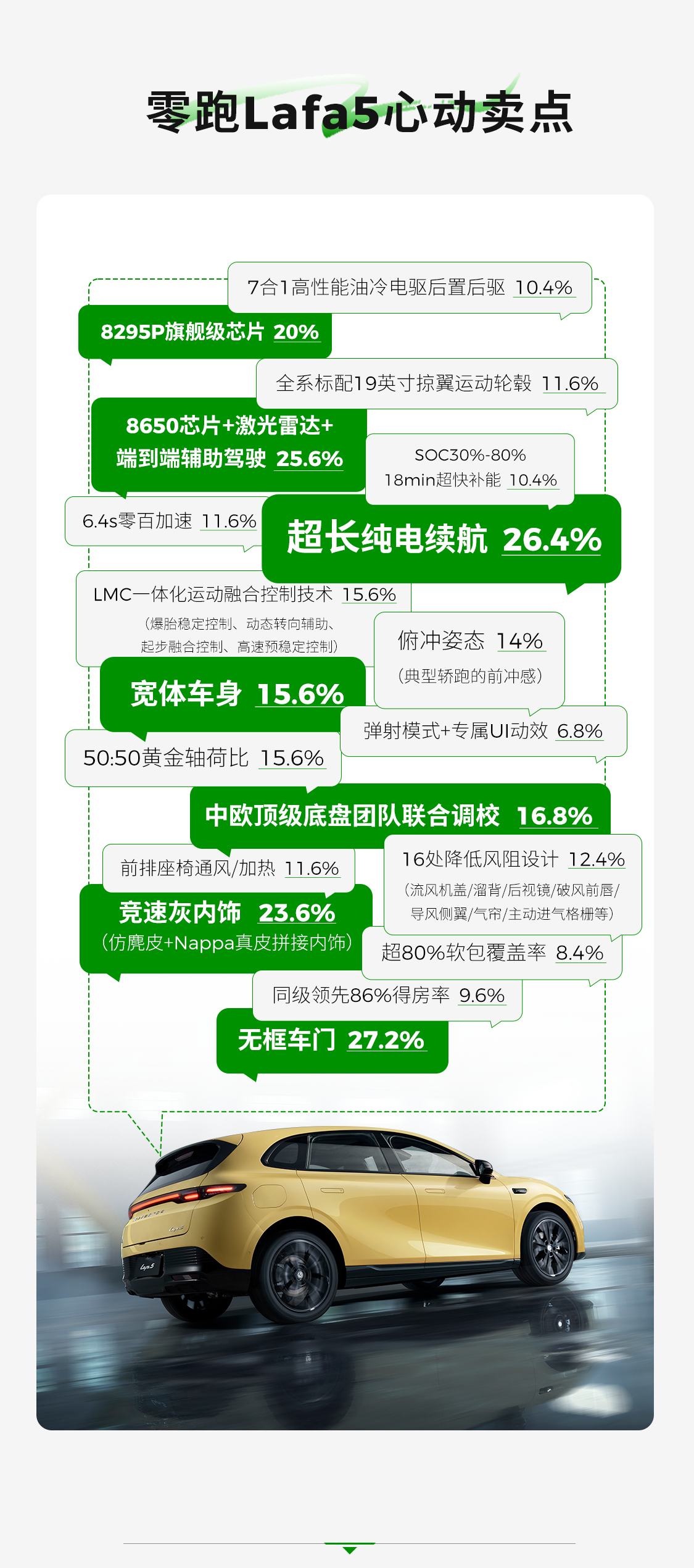 个性但不小众的成为了哪些年轻人的心动之选?✨超60%以上用户为90后✨近半数用户选择Max版✨在颜色偏好上40%用户青睐电掣黄……更多选车偏好,零跑Lafa5预订用户画像为你解密!