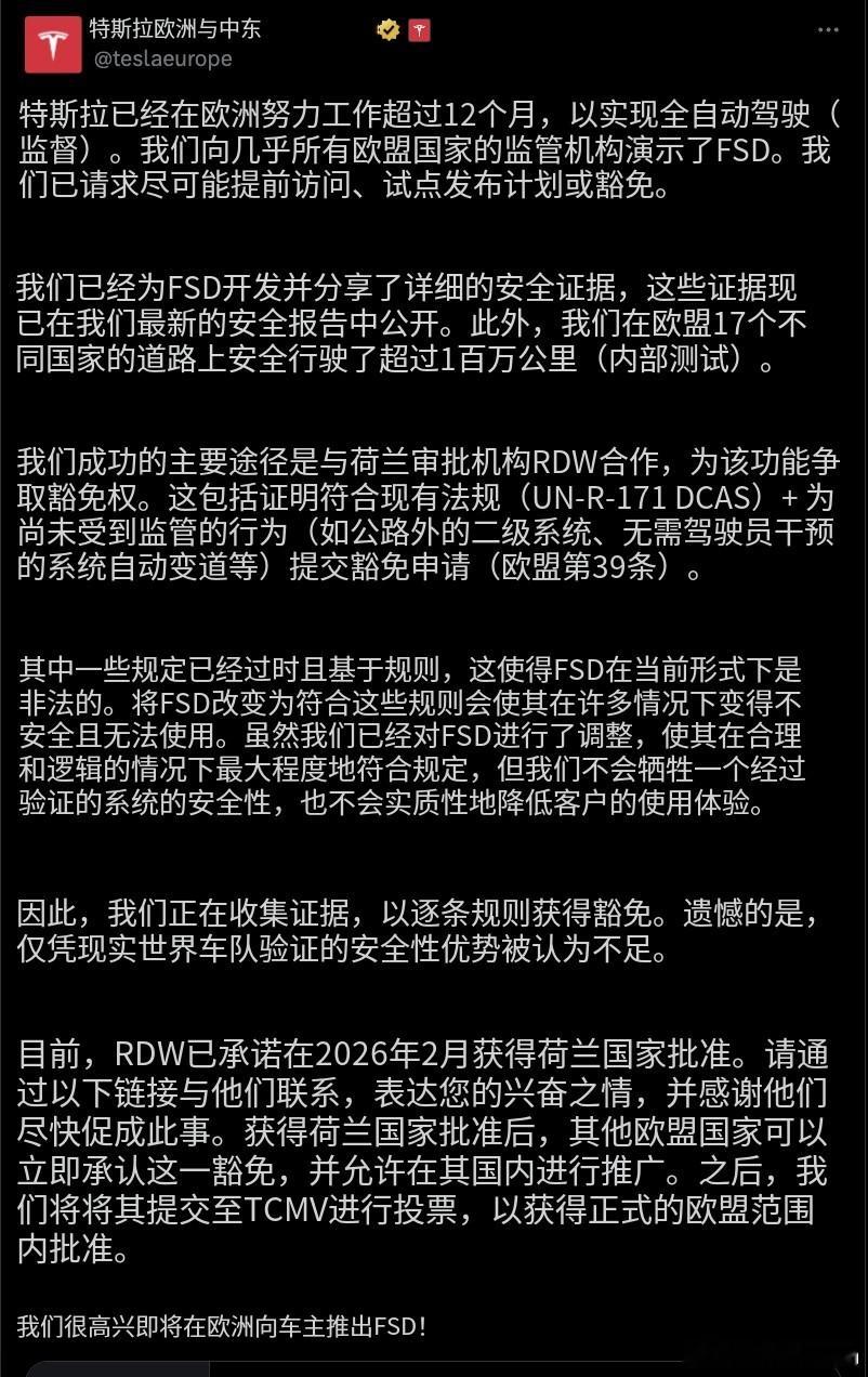 很羡慕,特斯拉欧洲和中东官方账号发文,表示明年2月FSD将能登录欧洲了看过程,确实很艰辛,各个机构对FSD的审核都非常谨慎不知道什么时候国内官方,也能发这么一条文章……