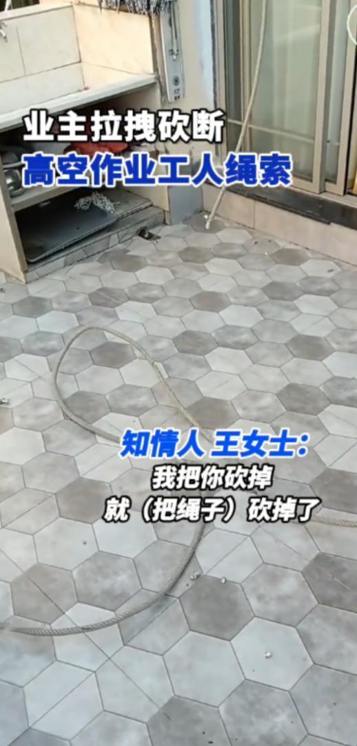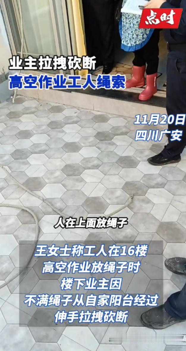 “必须严惩!”11月20日,四川广安,一女子带着工人高空作业,绳索从16楼放下去,结果3楼业主因不满绳子从自家阳台经过,竟然将绳子拉过来砍断,差点把放绳子的工人拽下去!报警后民警对业主进行了批评教育。网友:算不算故意杀人? 事情的经过说起来既荒唐又惊险,当天这位女子带着专业的维修队伍,来小区 16 楼天台进行高空维修作业,这是再正常不过的城市设施检修工作。 高空作业最关键的就是安全绳,那可是工人的 “命根子”,全身的重量、生命安全都系在这几根绳子上,工人们按规范固定好绳索,第一根绳子顺利放了下去,可就在第二根绳子放到一半的时候,楼顶的工人突然感觉手里的绳子猛地一沉,紧接着传来一阵剧烈的拉扯感,力道大到让常年从事高空作业、经验丰富的老师傅都瞬间吓出一身冷汗,整个人身体前倾,差点被这股拉力拽出天台边缘。 工人们赶紧朝下喊话,想让楼下的人住手,可回应他们的只有一片沉默,绳子上的拉力还在持续,甚至能感觉到绳子被什么东西反复切割的震动,他们心里咯噔一下,意识到可能有人在破坏安全绳,顿时慌了神,悬在半空中的绳子一旦断裂,后果不堪设想,轻则重伤重则丧命。 女子和工人们赶紧在楼顶沿着楼体往下查看,折腾了好一会儿,才发现是 3 楼的业主在搞鬼,对方手里还拿着砍断绳子的利器,地上散落着被割断的绳索纤维,原来这位 3 楼业主觉得,自家的阳台是私人空间,维修队的安全绳从阳台外经过,就是 “侵占” 了他的地盘,让他心里很不舒服,于是一时冲动就冲出去把绳子砍断了。 可他根本没想想,高层建筑的外立面维修,安全绳必然要顺着楼体垂下,难免会经过沿途住户的窗前或阳台外侧,这是物理规律决定的,不是想绕就能绕开的,而且维修作业也是为了小区设施的安全,对所有住户都有好处。 可这位业主完全不管这些,也不顾及高空作业工人的生命安全,仅凭自己的不满,就做出了砍断安全绳的极端行为,要知道当时绳子已经承载着部分作业重量,一旦完全砍断,16 楼到 3 楼的高度,工人坠落下来绝对是致命的,这哪里是简单的 “不满”,分明是把别人的性命当儿戏! 女子又气又怕当场就报了警,民警赶到后了解了情况,最终只是对这位 3 楼业主进行了口头批评教育就让他回去了,这样的处理结果一出来,不仅女子和工人们觉得难以接受,网友们更是怒不可遏。 大家纷纷留言质疑:“这已经不是简单的冲动了,是赤裸裸的漠视生命,难道不算故意杀人未遂吗?”“如果工人真的掉下去摔死了,是不是才会追究刑事责任?”“批评教育根本没用,这种人不受到严惩,以后还会做出更危险的事!” 网友们的愤怒不是没有道理,在建筑行业里安全绳就是工人的 “生命线”,这是所有人都知道的常识。,任何一个成年人,都应该明白砍断高空作业的安全绳意味着什么,这绝不是 “不知道后果” 就能搪塞过去的,这位业主的行为已经严重威胁到了他人的生命安全,远远超出了 “表达不满” 的范畴,性质极其恶劣。 想想当时的场景工人在 16 楼天台,突然遭遇绳子被砍断的冲击,那种瞬间的惊恐和危险,恐怕一辈子都忘不了,如果当时工人反应慢一点,或者绳子被砍断的瞬间拉力再大一点,后果不堪设想,一个家庭可能就此破碎,一个工人的生计和生命可能就此终结,而这一切,仅仅是因为业主的一点私人不满。 有人说,业主可能是担心绳子磨损自家外墙,或者觉得影响了自己的生活,但这些理由在一条鲜活的生命面前,显得那么苍白无力。 城市里的高楼越来越多,设施维修、外墙保养都是不可避免的事,今天你家需要维修,明天他家需要检修,如果每个人都像这位业主一样,用极端方式发泄不满,无视他人的生命安全,那这个社会还怎么正常运转? 网友们呼吁 “必须严惩”,不仅仅是为了给受惊吓的工人讨一个公道,更是为了敲响警钟,生命至上任何漠视他人生命安全的行为,都必须付出应有的代价。 只有让这样的人受到严厉的惩罚,才能震慑那些可能抱有侥幸心理的人,避免下一次类似的险情发生,毕竟谁也不敢保证,下一次被砍断的安全绳上,会不会真的有人因此坠落,真的有人为此付出生命的代价。 (信息来源:《师傅16楼高空作业被3楼业主砍断绳索》点时新闻)