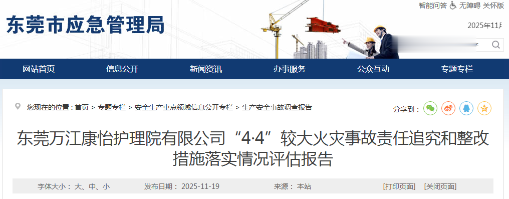 近日,东莞市人民政府官网发布《东莞万江康怡护理院有限公司“4·4”较大火灾事故责任追究和整改措施落实情况评估报告》(以下简称《评估报告》)的显示,事发后,东莞康怡公司法定代表人兼总经理陈志威被警方刑拘。2025年6月,东莞市第一人民法院作出判决:陈志威犯重大责任事故罪,判处有期徒刑一年。
