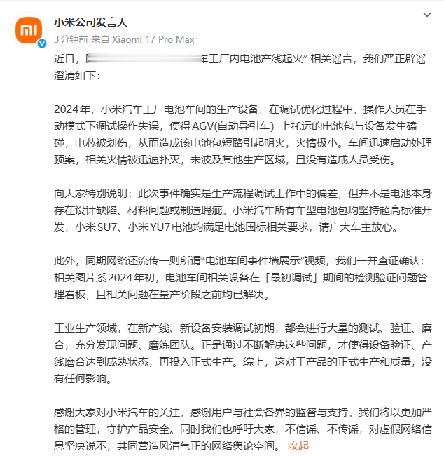 小米公司发言人发文表示:近日,网络谣传的所谓“小米汽车工厂内电池产线起火”相关谣言,我们严正辟谣澄清如下:2024年,小米汽车工厂电池车间的生产设备,在调试优化过程中,操作人员在手动模式下调试操作失误,使得AGV(自动导引车)上托运的电池包与设备发生磕碰,电芯被划伤,从而造成该电池包短路引起明火,火情极小。车间迅速启动处理预案,相关火情被迅速扑灭,未波及其他生产区域,且没有造成人员受伤。向大家特别说明:此次事件确实是生产流程调试工作中的偏差,但并不是电池本身存在设计缺陷、材料问题或制造瑕疵。小米汽车所有车型电池包均坚持超高标准开发,小米SU7、小米YU7电池均满足电池国标相关要求,请广大车主放心。此外,同期网络还流传一则所谓“电池车间事件墙展示”视频,我们一并查证确认:相关图片系2024年初,电池车间相关设备在「最初调试」期间的检测验证问题管理看板,且相关问题在量产阶段之前均已解决。工业生产领域,在新产线、新设备安装调试初期,都会进行大量的测试、验证、磨合,充分发现问题、磨练团队。正是通过不断解决这些问题,才使得设备验证、产线磨合达到成熟状态,再投入正式生产。综上,这对于产品的正式生产和质量,没有任何影响。