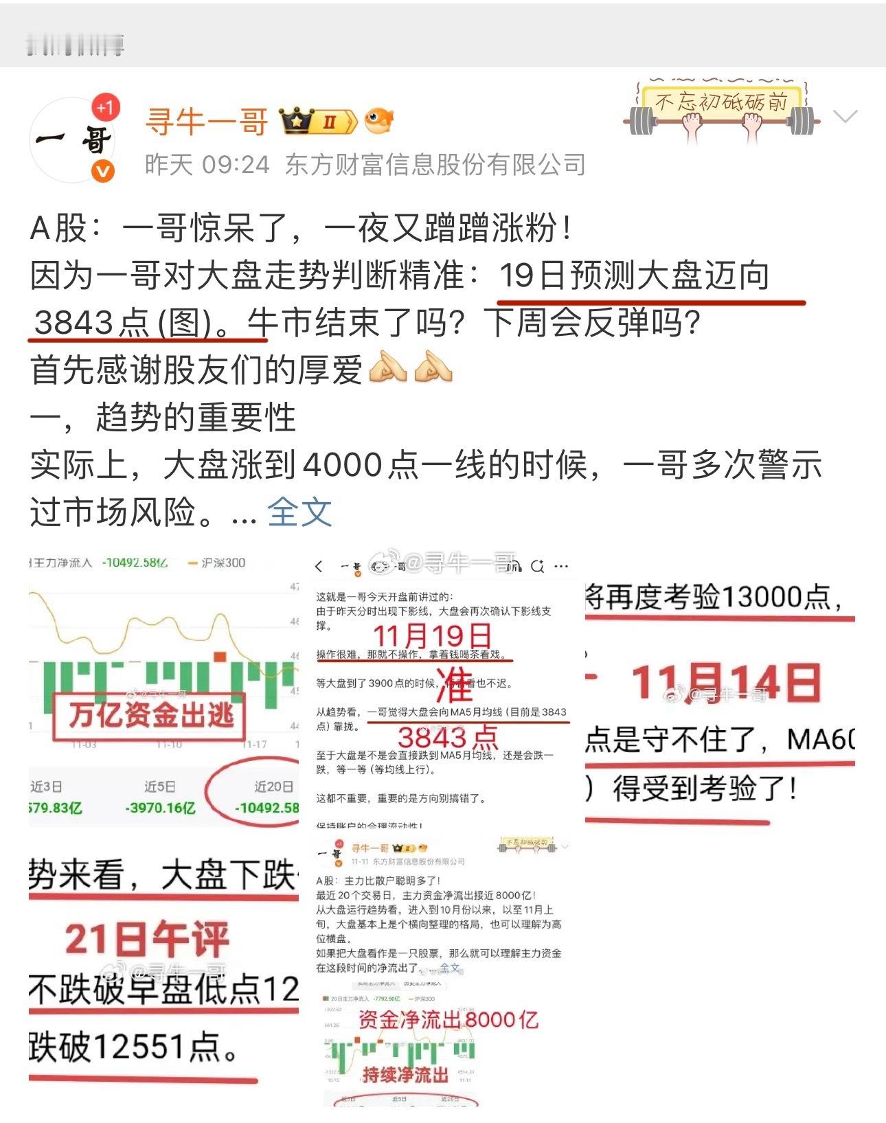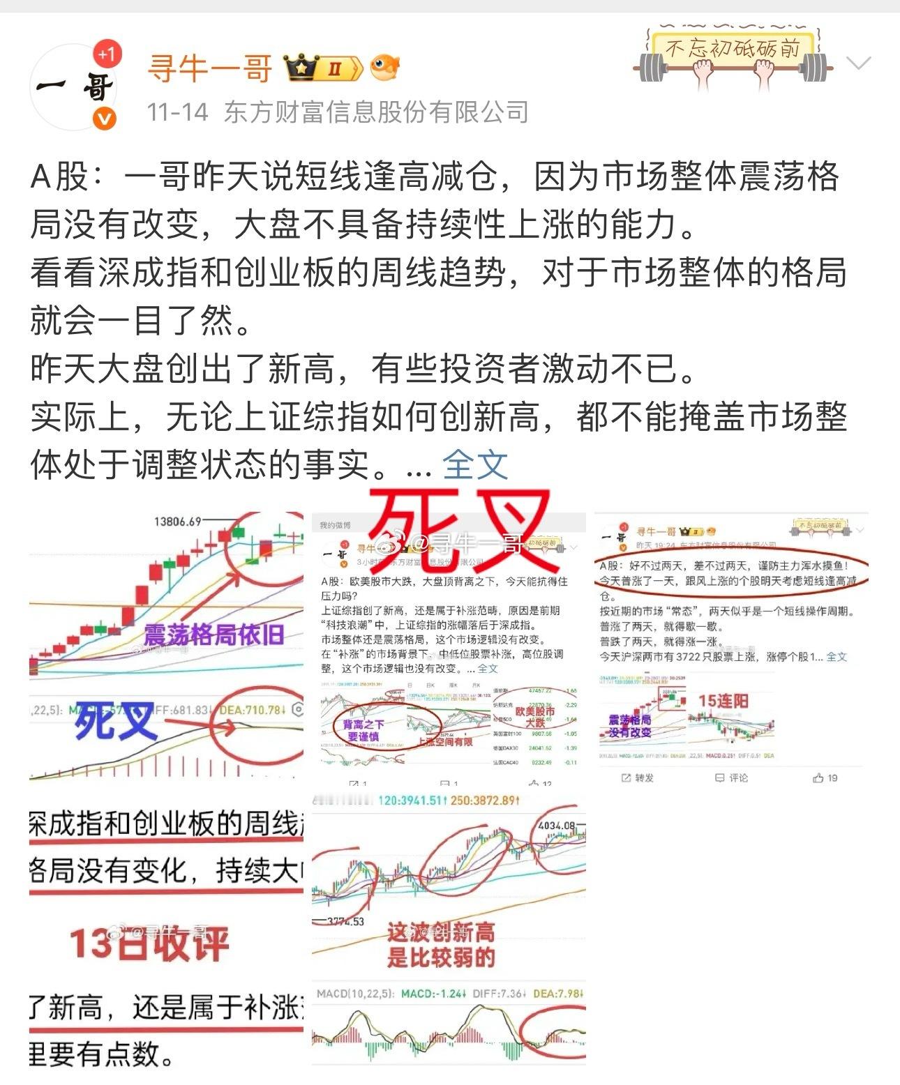 A股:一篇拙作,一哥昨天从成交量角度分析过大盘,今天换一个角度——趋势。下周可以博弈反弹。在昨天文中,一哥认为,与2015年相比,市场单日最大成交金额(沪市1.3万亿)没有到巅峰。一哥认为沪市单日巅峰成交金额会达到2万亿水平,由此得出结论:牛市还没有结束。一,市场大跌并非没有征兆走的人多了,就成了路。市场也是如此,趋势就是在资金多寡中形成或转换。对于市场趋势的发展,一哥从本月初开始就有些担心了。1,11月6日,一哥发文提醒:大盘收复4000点,该走还是得走(图)。一哥当天首次从周线趋势角度,提到了深成指趋势转弱,并与去年10月份之后到12月份的走势作了比较。PS:当天上证收盘4007点,深成指收盘13452点,创业板收盘3224点。2,11月11日,一哥继续提醒创业板偏空(图)。当天创业板指MA20均线向下跌破了MA30均线——这是大盘高位震荡期间首次出现!3,11月14日,一哥提到创业板周级MACD已经死叉(图)。4,11月17日,一哥再次提到了深成指,同时指出深成指会向12700点区域靠拢(图)。5,11月19日,一哥提示上证综指将向3843点(也就是彼时的MA5月均线)靠拢(图)。PS:上证综指上周收盘3834.89点,创业板指收盘2920点,深成指收盘12538点。从上述事实中,可以发现,市场趋势是逐渐恶化的。上周五市场大跌,并不是无迹可循。作为普通投资者,我们无从知道市场会在什么时刻恶化,但我们可以在恶化之前规避可能的风险。二,趋势分析1,箱体从2015年12月到今年8月份市场站上3700点之前,10年期间,大盘整体上在一个类箱体内运行。这个箱体底线在2650点一线,箱体顶部区域则在3700点区域。9月6日有过一次大跌,最低点是3732点,而3731点是10年箱体的最高点(2021年2月)(图)。这不是巧合。一哥认为这可以视为大盘在突破箱体之后的一次回踩动作。大盘是不是会再次回踩,目前不确定。一哥认为这个箱体顶部区域有强支撑。2,均线目前上证综指MA5月均线位于3820点,上周收盘3834点,几乎要摸到均线了。一哥觉得,MA5月均线可以跌破,跌破了不代表市场趋势完全破坏了。当然,破而不漏是理想状态。3,换手率8月份至今,市场整体换手率已经超过了100%。7月份上证综指最高点是3636点。是不是可以理解为市场整体成本已经在3600点上方?4,趋势比较大盘站上4000点之后,不少人期望值很高。看高4500点,甚至5000点的大有人在。“速胜”心态,让很多投资者忘记了资本市场是残酷的事实。管理层要的是慢牛,不是2015年那种直上直下的行情。化债没结束,市场改革还在路上,股权财政需要股市支持……一哥觉得,目前的市场情况与2020年3月起的发展过程很相似。至少在形态上是如此。PS:下周大盘会出现“短线”抄底机会,但具体跌到哪个点位止跌反弹,无从预测。一哥盘中会密切关注。个人观点,仅供参考,对错勿怪!理财有风险,投资需谨慎!