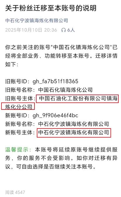 2025年10月10日,公众号“中国石油化工股份有限公司镇海炼化分公司”正式更名为“中石化宁波镇海炼化有限公司”。