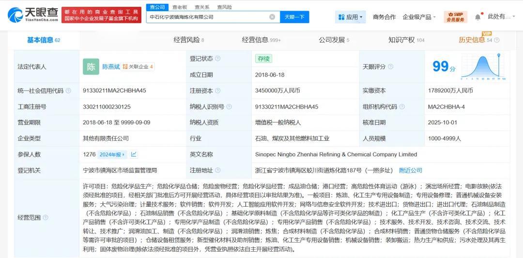 该公司成立于2018年6月,法定代表人为陈燕斌,经营范围含危险化学品生产、危险化学品仓储、危险废物经营、演出场所经营、专用设备修理、普通机械设备安装服务、网络与信息安全软件开发、石油制品销售等。股东信息显示,该公司由中国石化(600028)、宁波甬镇投资有限公司共同持股。