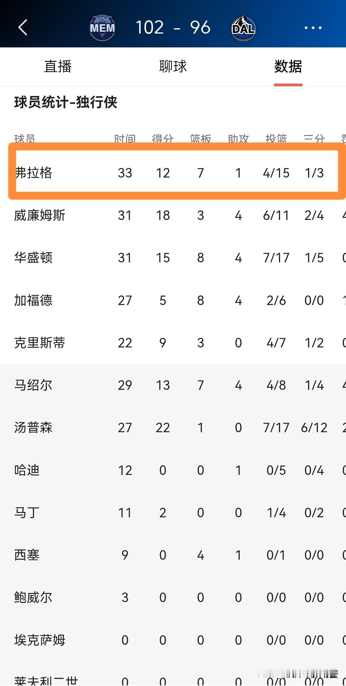 独行侠天才新星弗拉格真是无药可救了!在今天独行侠主场以96:102输给灰熊的比赛中,弗拉格的表现真是特别的糟糕。 整场比赛下来,弗拉格首发出战33分钟,投篮15中4,其中三分球3中1、罚球4中3极为低效的得到12分,他的场上正负值为-5。 毫不客气的说,以弗拉格的表现来看他完全不配成为独行侠的基石,他的投篮真是糟糕透顶。