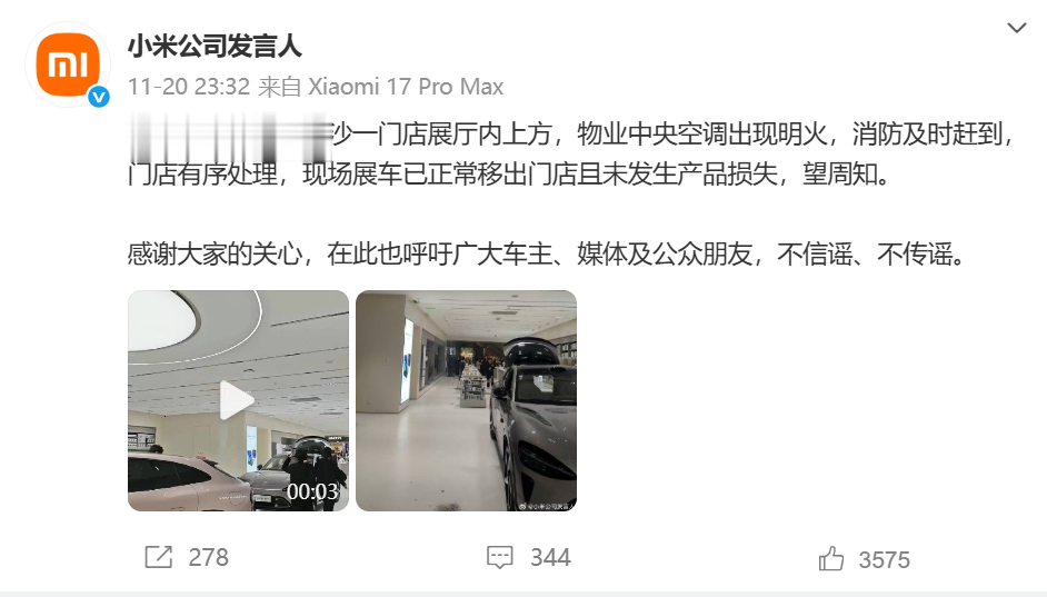 11月20日深夜,小米公司发言人称,当晚小米汽车长沙一门店展厅内上方物业中央空调出现明火,消防及时赶到,门店有序处理,现场展车已正常移出门店且未发生产品损失。“呼吁广大车主、媒体及公众朋友,不信谣、不传谣。”
