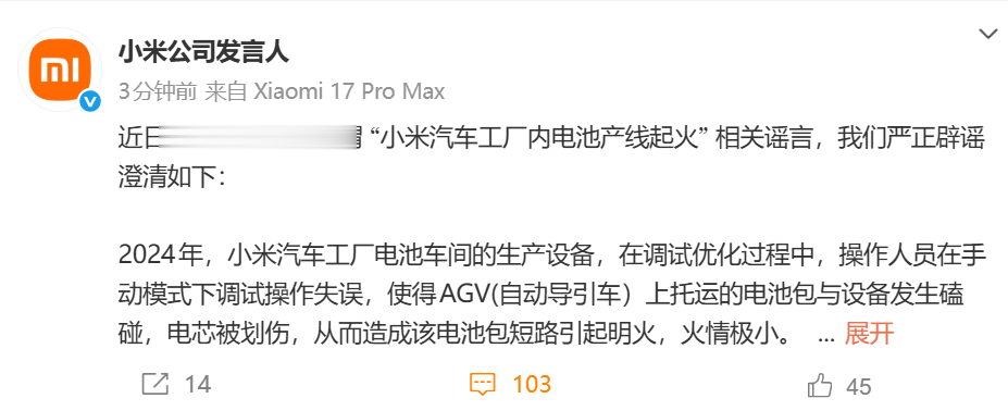 小米公司发言人称,2024年,小米汽车工厂电池车间的生产设备,在调试优化过程中,操作人员在手动模式下调试操作失误,使得AGV(自动导引车)上托运的电池包与设备发生磕碰,电芯被划伤,从而造成该电池包短路引起明火,火情极小。车间迅速启动处理预案,相关火情被迅速扑灭,未波及其他生产区域,且没有造成人员受伤。