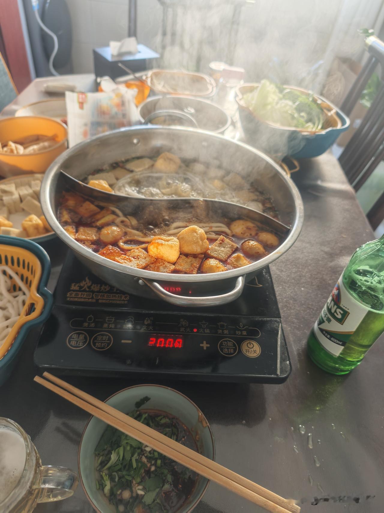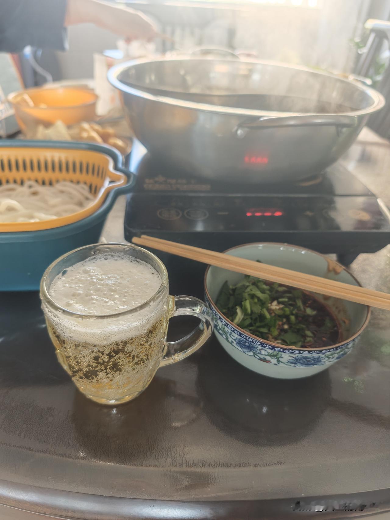 今天中午饭,为孩子回家总喜欢吃火锅,我就喝一瓶啤酒吃点菜。