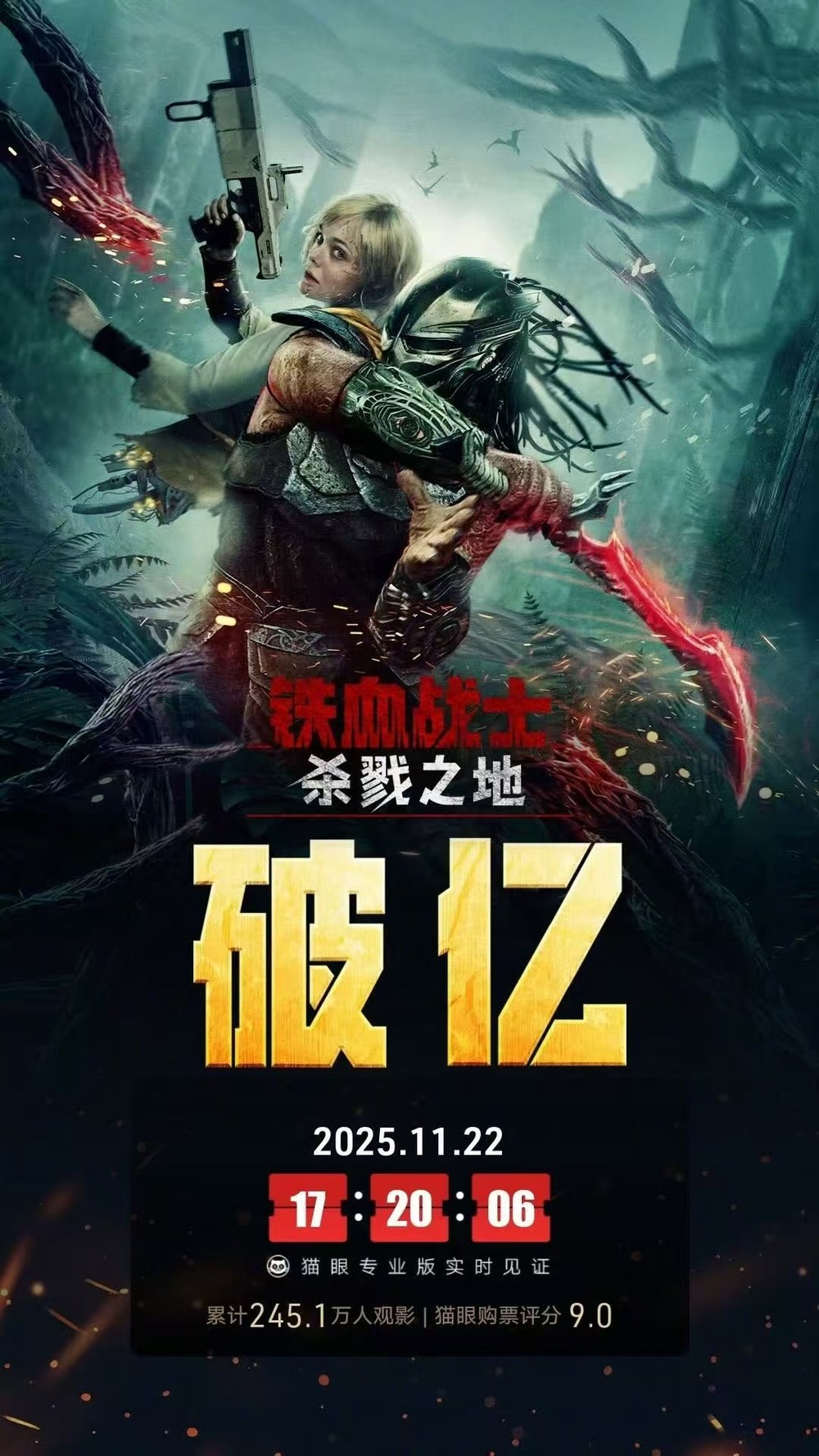 据猫眼专业版数据,电影《铁血战士:杀戮之地》上映16天,票房破1亿元。