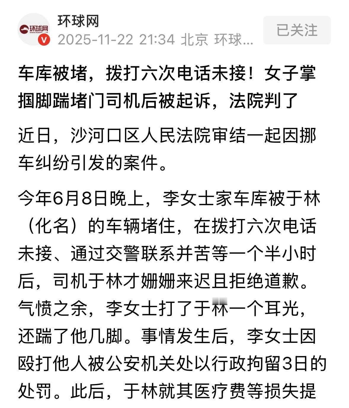 辽宁大连,女子家的车库被另一辆车堵住,她给车主打了6个电话都没人接,只好报警,又等了一个半小时后,车主终于晃晃悠悠来了,然而,他却拒绝道歉,女子怒火中烧,扬手就打了车主一巴掌,车主报警后,女子被行拘3天,出来后,女子万万没想到,自己又被车主告上法庭,要求赔偿他4000多块医药费,外加600交通费。法院判决让女子长了个教训。 2025年6月8号傍晚七点,天色刚擦黑,李女士和丈夫开车回到自家楼下。 车头刚拐进小区通道,两口子就傻眼了,只见车库门前横着一辆陌生轿车,堵得那叫一个严严实实。 李女士下车来到轿车前看了眼,按车主留下的手机号打了过去。然而,第一遍忙音,第二遍没人接,打到第六遍时,听筒里依旧传来一阵嘟嘟声。 丈夫劝她再等等,李女士没那个耐心再等,直接报了警。 最后,在交警的联系和责令挪车下,车主才终于现了身,此时距离李女士报警,又过去了一个半小时。 就在李女士耐心已经被耗尽的时候,远处终于慢悠悠晃来个身影,正是车主于林(化名)。 李女士迎上去,没好气地对于林说:你的车挡着我家车位了。 没想到,于林听后不仅没有丝毫歉意,还挠了挠后脖颈,一脸无所谓地说:这不空地儿嘛! 这句话像火星子溅进油锅,当场就把李女士点炸了,她甩手就朝对方脸上抽过去,还没等于林反应过来,她又抬腿补了两脚。 于林被打懵了,等反应过来,他也没还手,而是直接报了警。 警方赶到时,于林捂着脸直嚷嚷,说警察同事你看看,我好好来挪车,结果无缘无故被她打了,你们可得处罚她啊! 李女士这才看清对方脸上红通通的巴掌印,知道自己冲动了。 事后,警察调取了监控,认定了李女士殴打了于林的事实,并对李女士作出行政拘留3天的处罚。 李女士出来后过了几个月,一张法院传票又送到了她手上。 原来,于林当时声称自己被打伤了,去医院做了治疗,现在他把李女士告上法庭,要求李女士赔偿他4131.28元医药费,外加600块交通费。 李女士对此觉得冤枉至极,是对方先不管不顾堵她家车库的,她打了6通电话对方都不接,要不是交警联系,她还不知道要等多久,对方来了不道歉不说,还那么嚣张,现在反倒赖她头上了,她心中的委屈找谁说去? 有人说,事情的起因是违停者严重影响了他人的合法权益,多次电话联系得不到解决,所以不管造成什么后果,只要引起冲突违停者的行为都转化成寻衅滋事要承担法律后果被惩处。 违停堵住别人的车库,耽误别人出行,交警联系后还让人等一个半小时,正常人都会大骂。侵害别人利益还好意思起诉别人? 也有人认为,堵门你可以报警或相关部门处理的但不能以此成为打人的理由,因堵门造成的损失可以起诉堵门者,但动手打人就违法。 那么,从法律角度,怎么看待这件事? 根据《治安管理处罚法》第43条,殴打他人或故意伤害他人身体的行为,处五日以上十日以下拘留,并处二百元以上五百元以下罚款。 李女士因车库被堵产生愤怒情绪,在对方到达现场时实施殴打行为,构成治安违法行为,公安对她处以行政拘留3天的处罚符合法律规定。 那么被打的于林是否存在过错?答案是他不仅错了,还构成双重过错。 根据《民法典》第1173条规定:被侵权人对同一损害的发生或者扩大有过错的,可以减轻侵权人的责任。 于林把车辆停放在李女士家车库门前专用通道,违反《道路交通安全法》第56条关于“禁止占用消防通道、专用车位”的规定,构成对李女士合法财产权的侵害。 其二,于林在接到交警移车通知后还迟到一个半小时,且到达现场后拒绝道歉并否认停车不当,进一步激化矛盾。 法院认定,符合“被侵权人过错减轻侵权人责任”的立法精神。 法官审理认为,于林停车确有不当,但李女士动手打人得担主责。 最终,法院判决李女士承担80%的责任,赔偿于林医疗费3305元,以及交通费160元。于林自己承担剩余20%的责任。 判决下来后,李女士表示不会上诉。现在想想,当初要是不冲动行事,也不至于赔进去3天自由又搭上几千块。 所以,这个处罚她认了,就当长教训了。 又有人说,这个判决对于这个案件来说没问题,赔偿完之后,女子可收集证据,因为他堵车,大家出不去造成的经济损失,然后另案再起诉他,随随便便他赔的不止这个的10倍。 打人固然不对,先对打人处罚完毕,应该对被打者有所惩罚才对,恶意堵车且态度恶劣,影响他人正常出行,也要严惩! 对此,你怎么看? 关注@运良说法. 学法律知识不迷路