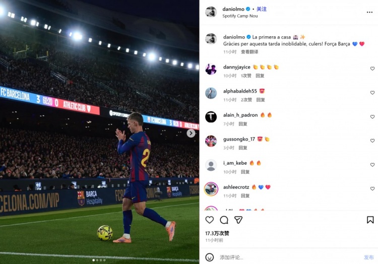 已加盟15个月!奥尔莫社媒纪念:诺坎普的首场比赛,感谢球迷支持