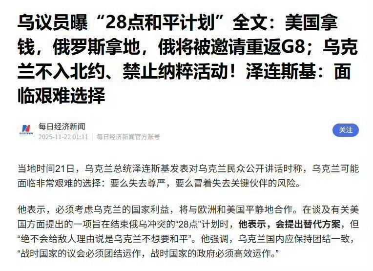 最新消息,说这个28条是假消息,万斯也否定了网上的28条内容,具体情况,还要征求乌克兰的意见。说句实在话,如果现在传出来的这个28条能通过,俄罗斯和美国就相当于二战时期盟国的关系了。别的就不说了,很多人会为俄罗斯的胜利高兴呢。热点观点