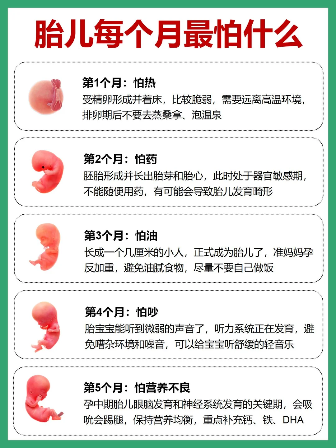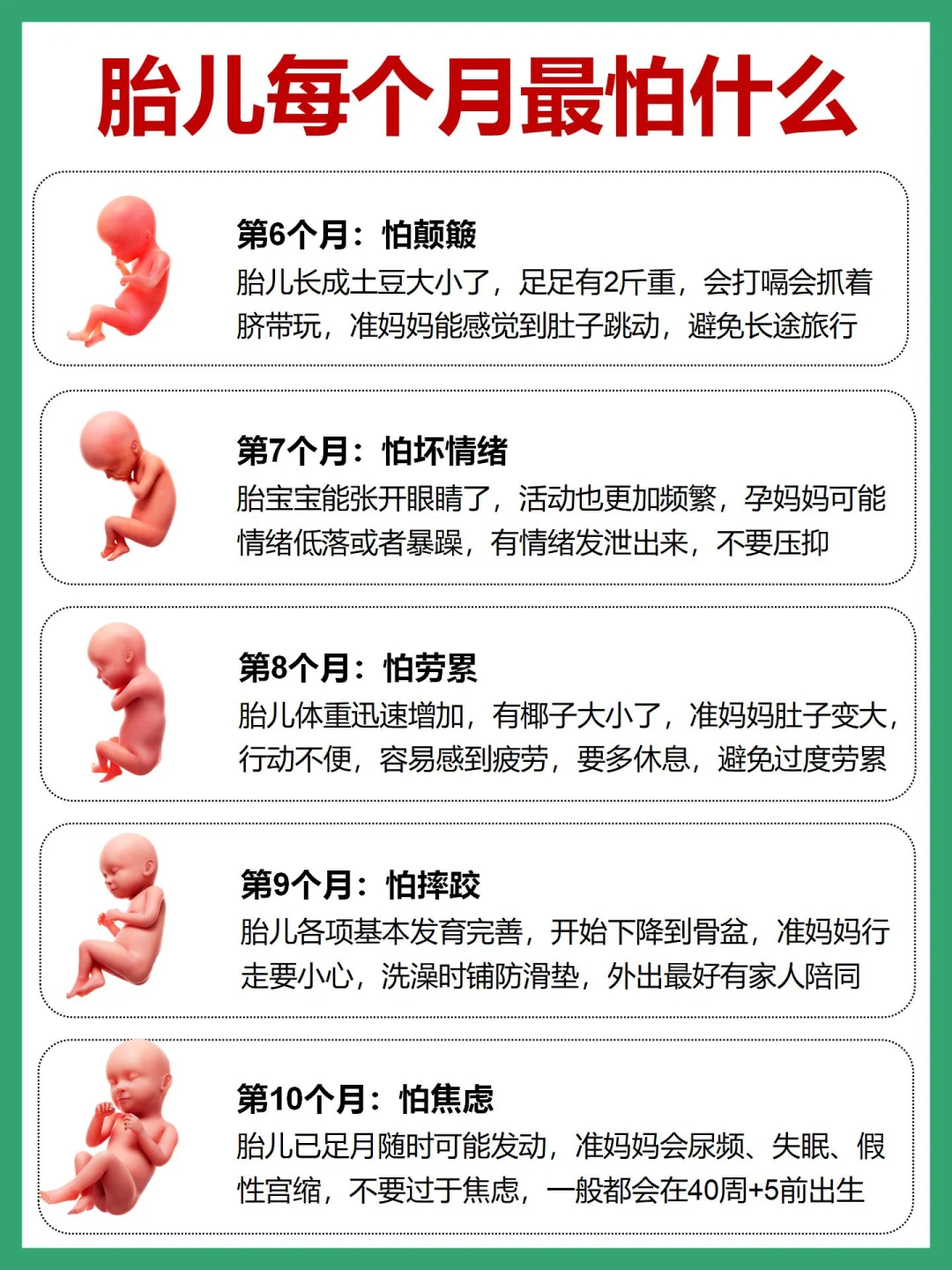 从一颗小小的受精卵,到形成胚泡、胚囊、胚胎,再到长成几厘米的小人,再慢慢长成菠萝蜜大小,胎宝宝如何顺利长大出生呢? 这篇整理了怀孕1-10月每个月胎宝宝最害怕的东西,准妈妈要牢记哟 ·