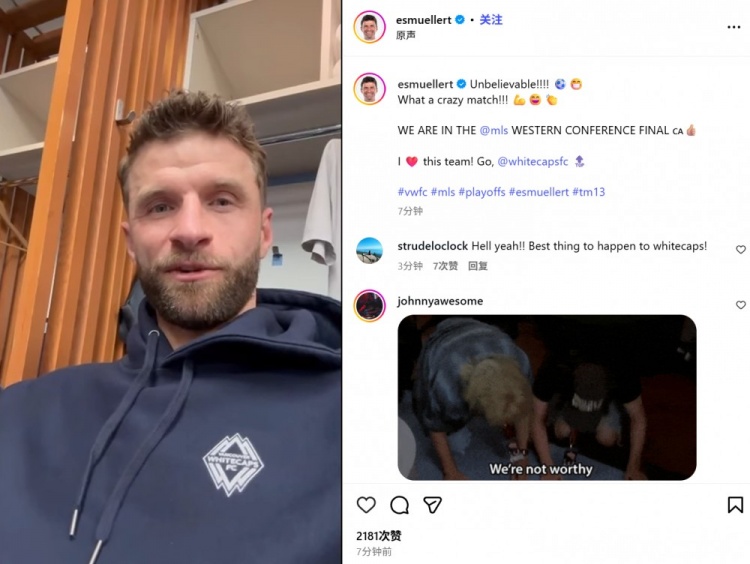 他也在赛后通过社媒纪念晋级:“难以置信!!!!⚽😁多么疯狂的一场比赛!!!💪😄👏我们晋级西部决赛了👍🏼我这支球队!加油,@温哥华白浪🔝”